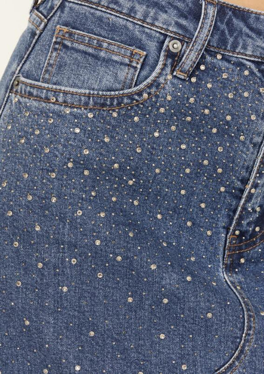 Rock&Roll Women's Denim Medium Wash Rhinestone Studded Maxi Skirt