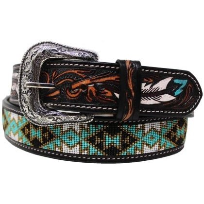 Challenger Western Tooled Beaded Inlay Leather Belt Black/White