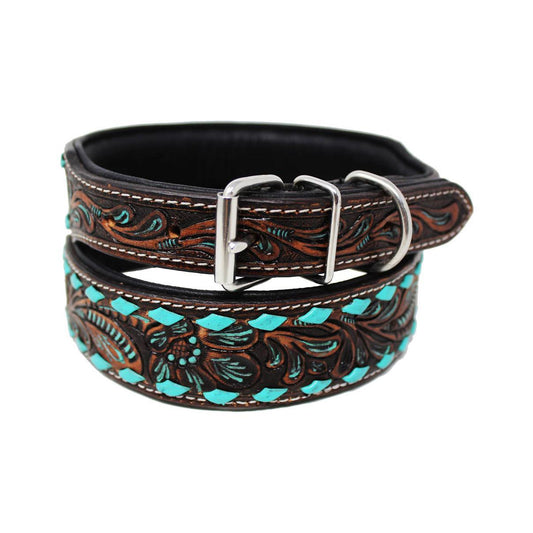 Challenger Dog's Amish Cow Leather Padded Tooled Collar Brown Turquoise