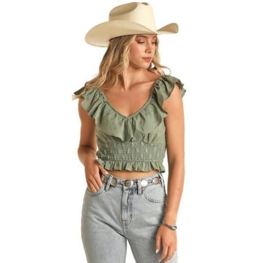 Rock & Roll Women’s Top Ruffle V-Neck Smocked Waist