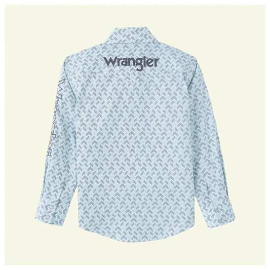 Wrangler Boy's Western Shirt In Aqua/Grey Print, Wrangler Down Sleeve/Chest Pocket