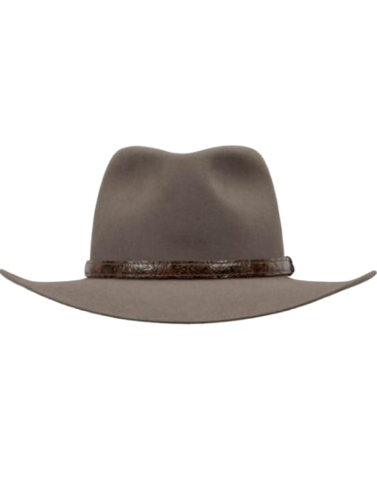 The Angler from Akubra's Heritage Collection has the style and flair of the Australian outback, with a pinched telescope crown and rolled brim with front and back down. The hand braided leather band is done in six strands, with end fringe and braided keepers.