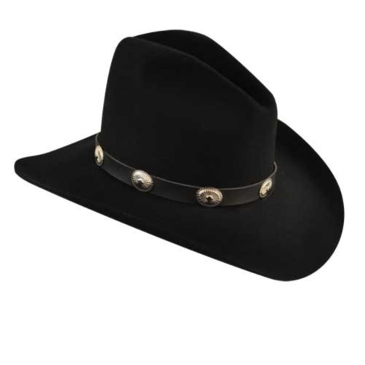 The Bailey Unisex Tombstone Black Felt Western Hat is a classic choice featuring a 5.5" tall Gus crown and a 4" brim. It's crafted from a 2X wool blend felt for quality and durability, and finished with a stylish leather hat band accented with conchos.
