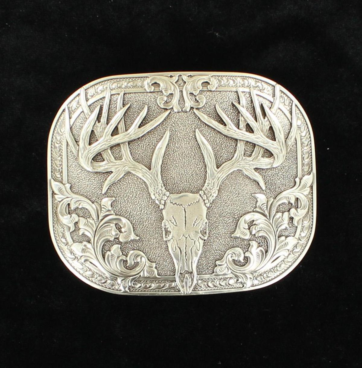 This buckle from M&F Western Products is stunning. There is a scrolling pattern border with deer skull in the center. Smooth edge.