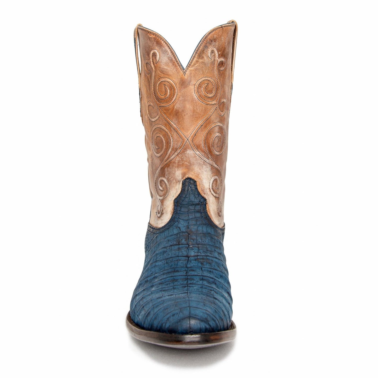 An instant classic, this pair of Black Jack boots features a burnished leather shaft with hand-stitched design mounted on a deep blue caiman vamp.