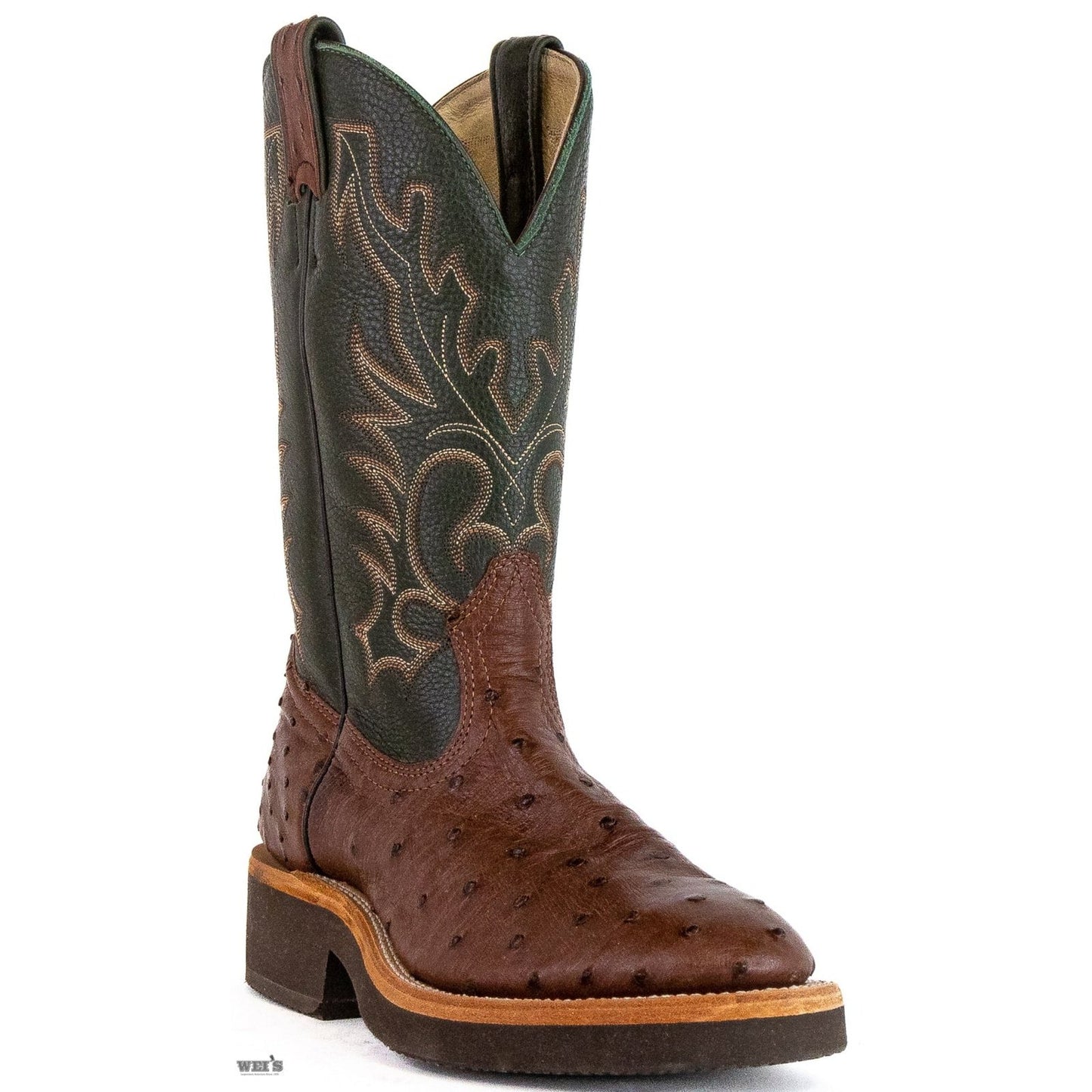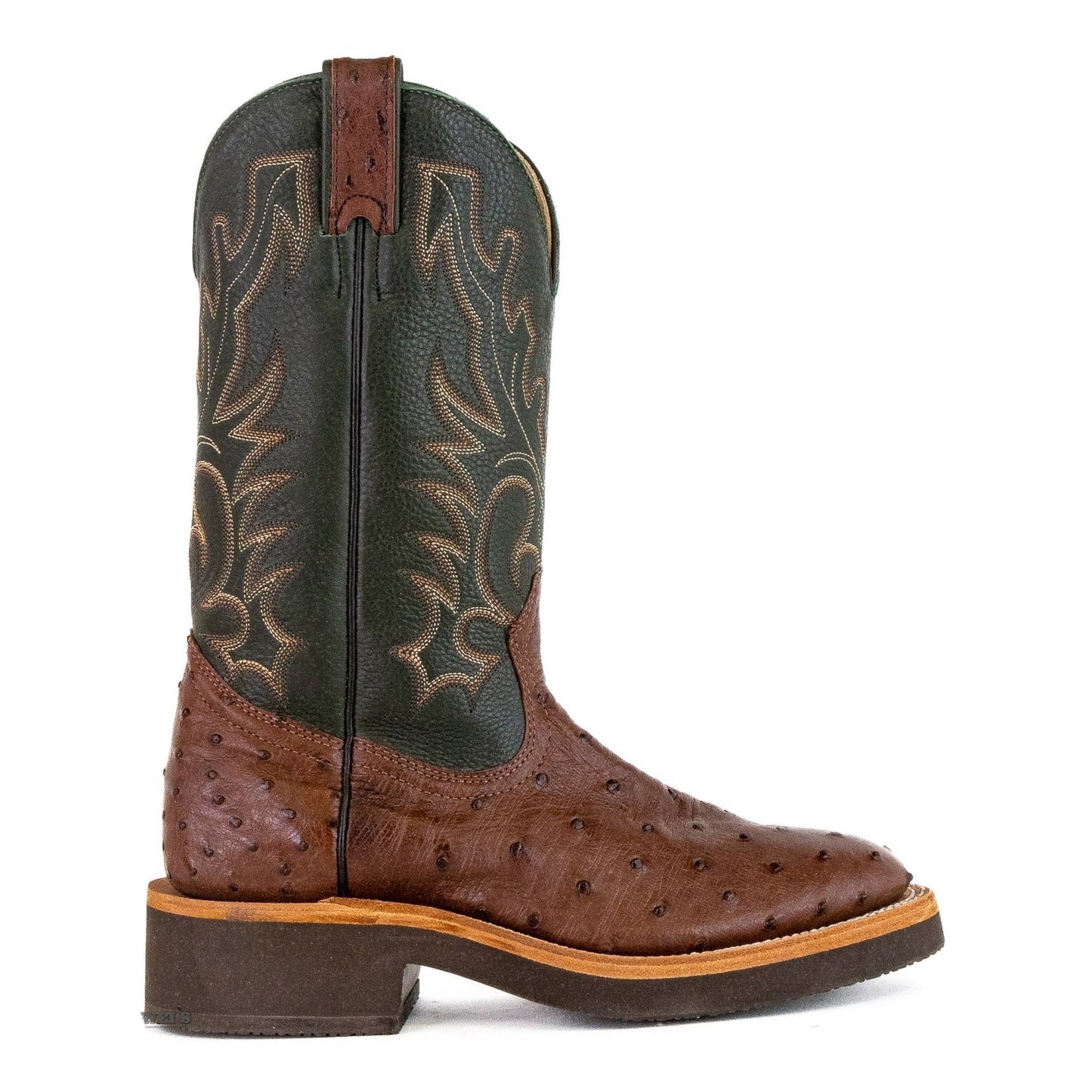 Comfortable and great-looking, this chocolate full quill ostrich boot comes with a green shaft with dynamic embroidery, on a comfy crepe sole. Quality construction throughout, with double stitched Goodyear welting and made in Canada quality.
