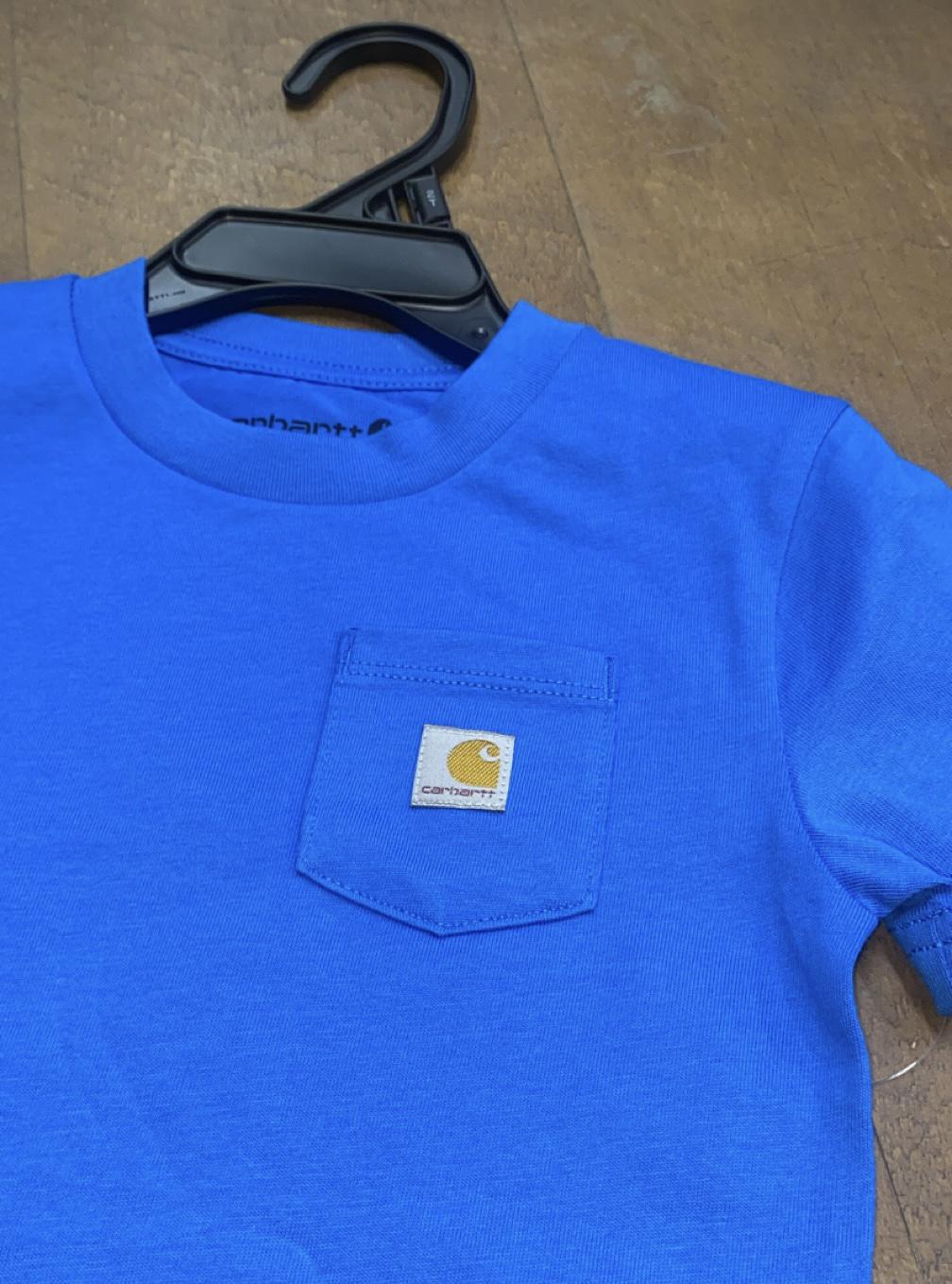 Dress your little one in comfort and durability with the Carhartt Toddler Boy's Short Sleeve Pocket T-Shirt in Bright Blue. Crafted from midweight 100% cotton jersey, this shirt offers a soft feel and breathable wear, perfect for active toddlers. The rib-knit crew neck ensures a comfortable fit, while the side-seam construction minimizes twisting, keeping the shirt in place during play.