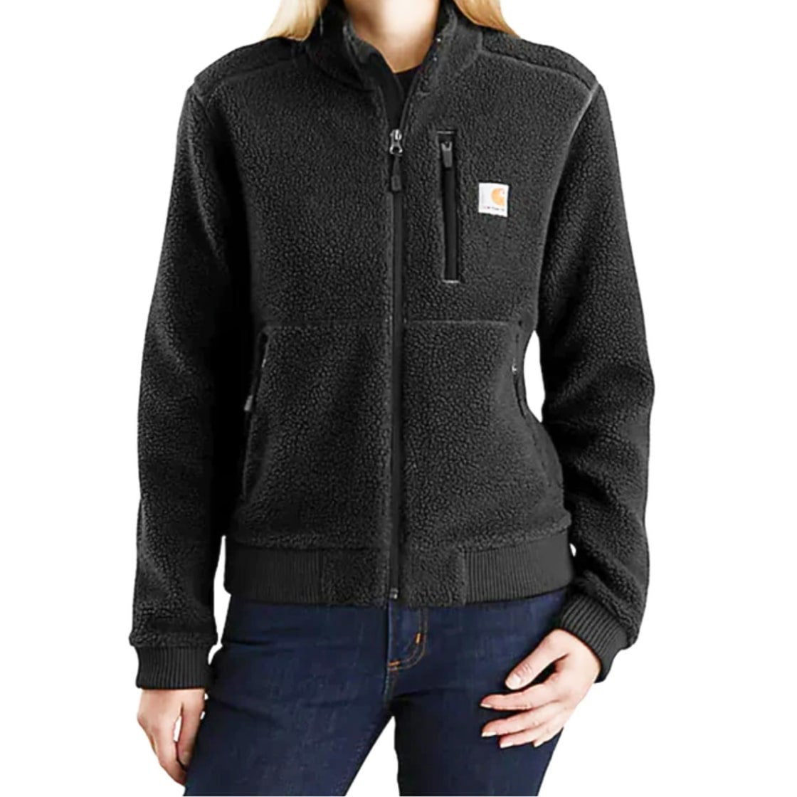 This Carhartt women's full-zip sherpa fleece jacket cuts the chill on a cool morning. It's cut for a relaxed fit that allows for easy layering with a mock neck that helps seal out the cold. Zip handwarmer pockets and a chest pocket keep essentials close.