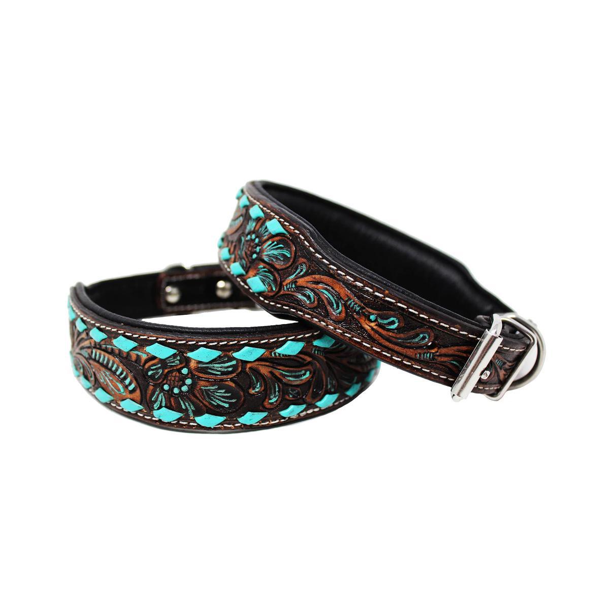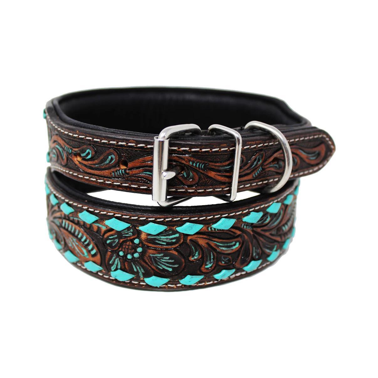 Challenger Dog's Amish 100% Cow Leather Padded Tooled Collar Brown Turquoise