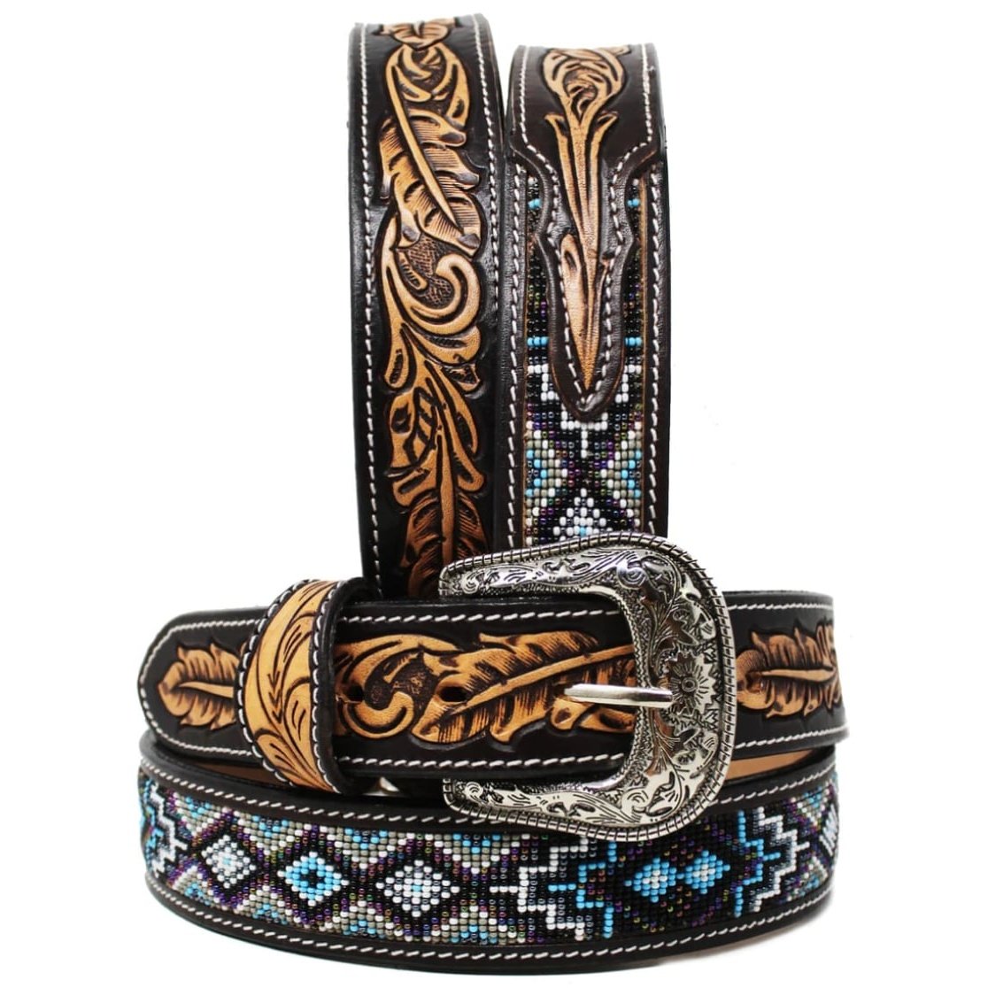 Adult Unisex Men's Women Full-grain heavy duty 1-1/2" wide leather belt with removable belt buckle. Accented with a hand tooled finish and beaded inlay.