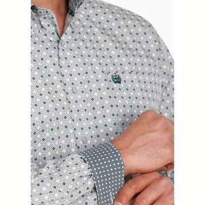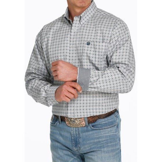 Dress casual but still look sharp wearing this long-sleeved grey cotton plain weave crafted by Cinch. Design features include a geometric print.