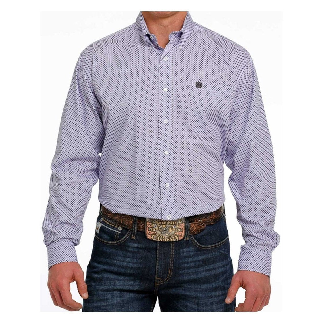 Cinch crafts classic men's casual shirts, like this lilac geometric printed cotton plain weave. It will have you looking your best, from sunup to sundown. Design details include an open left front pocket with embroidered Cinch logo and white buttons.