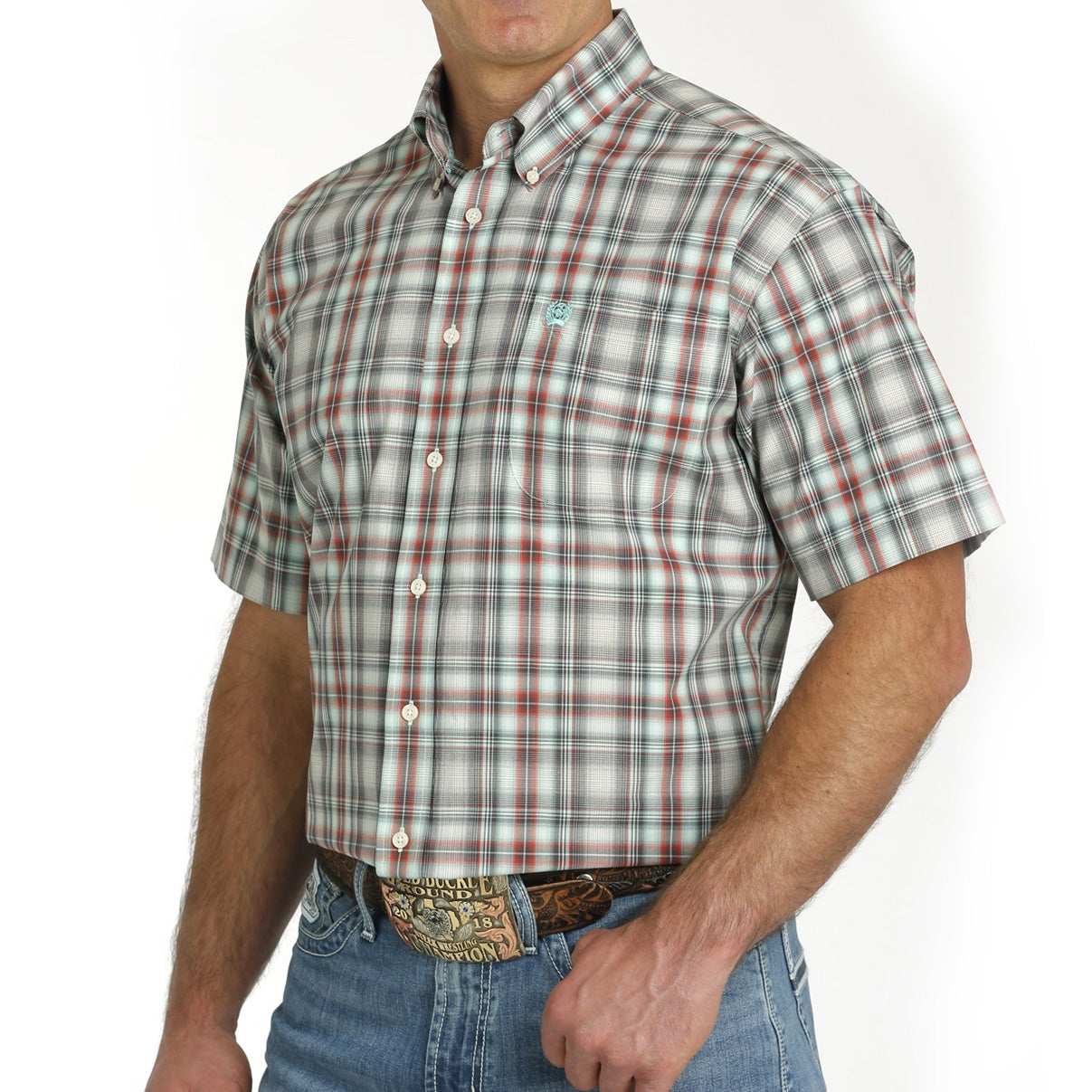 This multicolor plaid cotton plain weave by CINCH offers the classic warm weather look you need for styling with blue jeans or khaki shorts. Design details include an open left front pocket with embroidered logo and cream buttons.