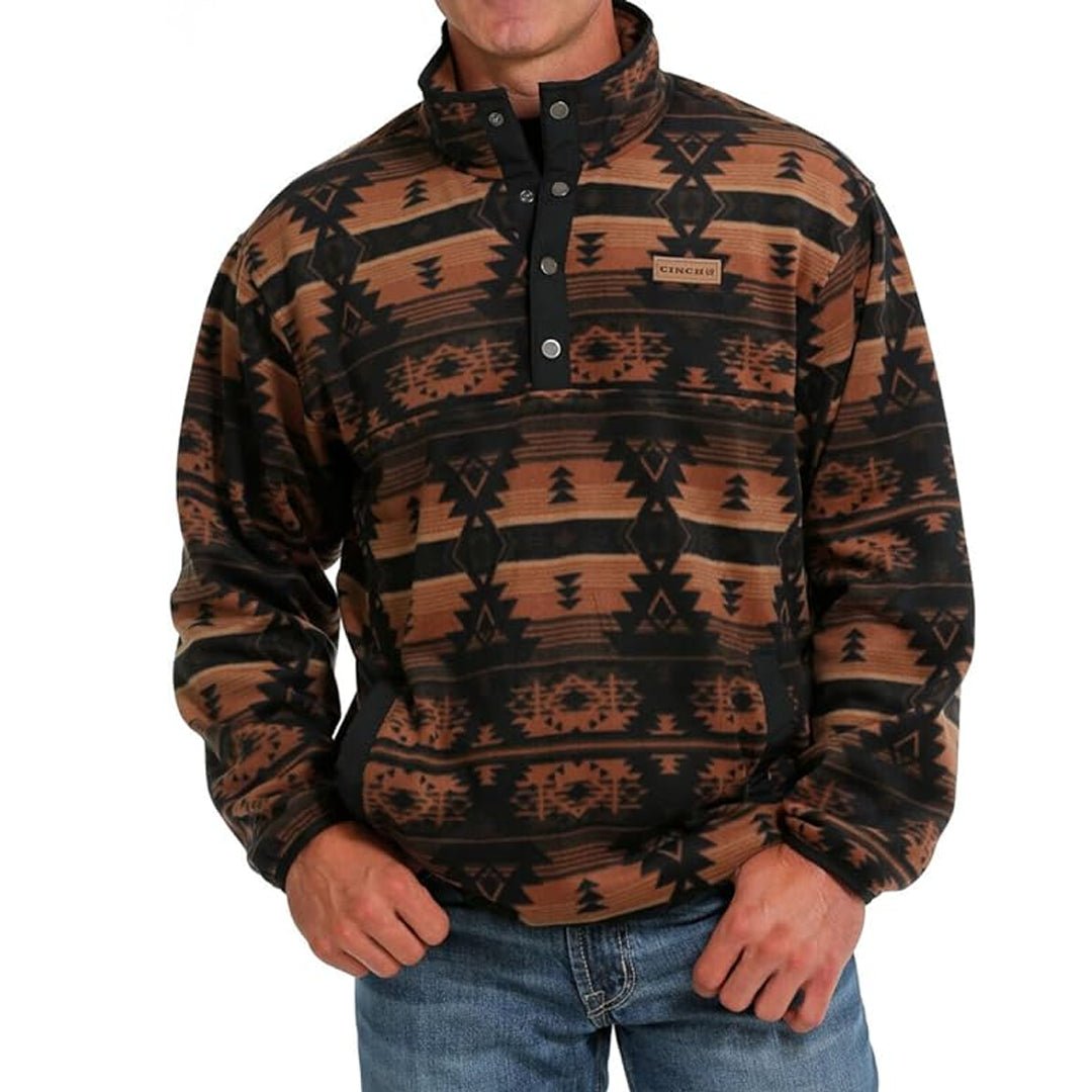 When you're really into the outdoors, this brown printed polar fleece pullover is a must-have wardrobe addition. Comfortable poly-spandex construction features a snap placket, convenient hand pockets and a faux leather CINCH logo patch.