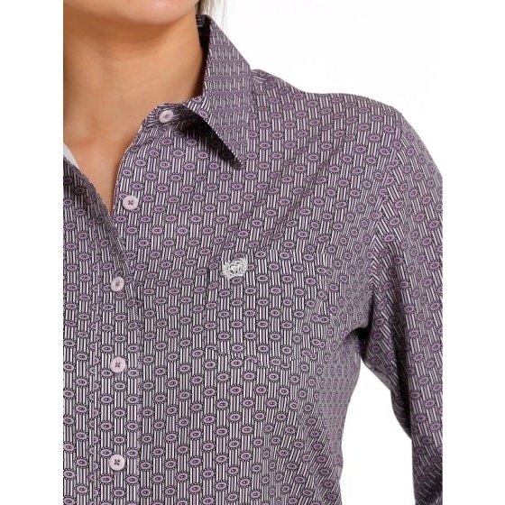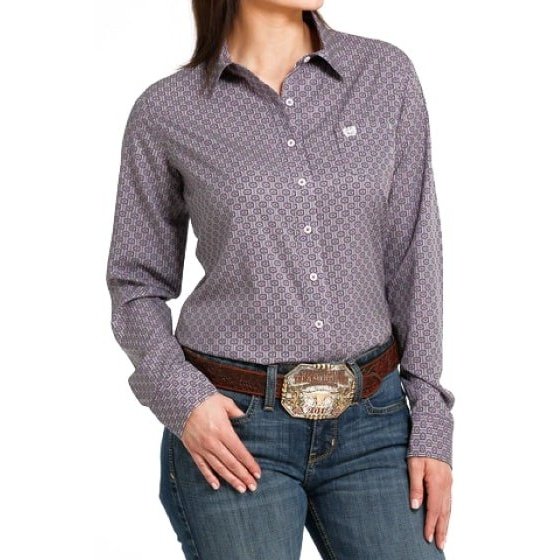 The Cinch Arenaflex Lilac Print Shirt ensures comfort with Arenaflex Technology, a 97% Polyester, 3% Spandex blend. Its long sleeve style and lilac marbled buttons set this shirt apart, while the embroidered logo in white gives it a classic finish. Perfect for any occasion.