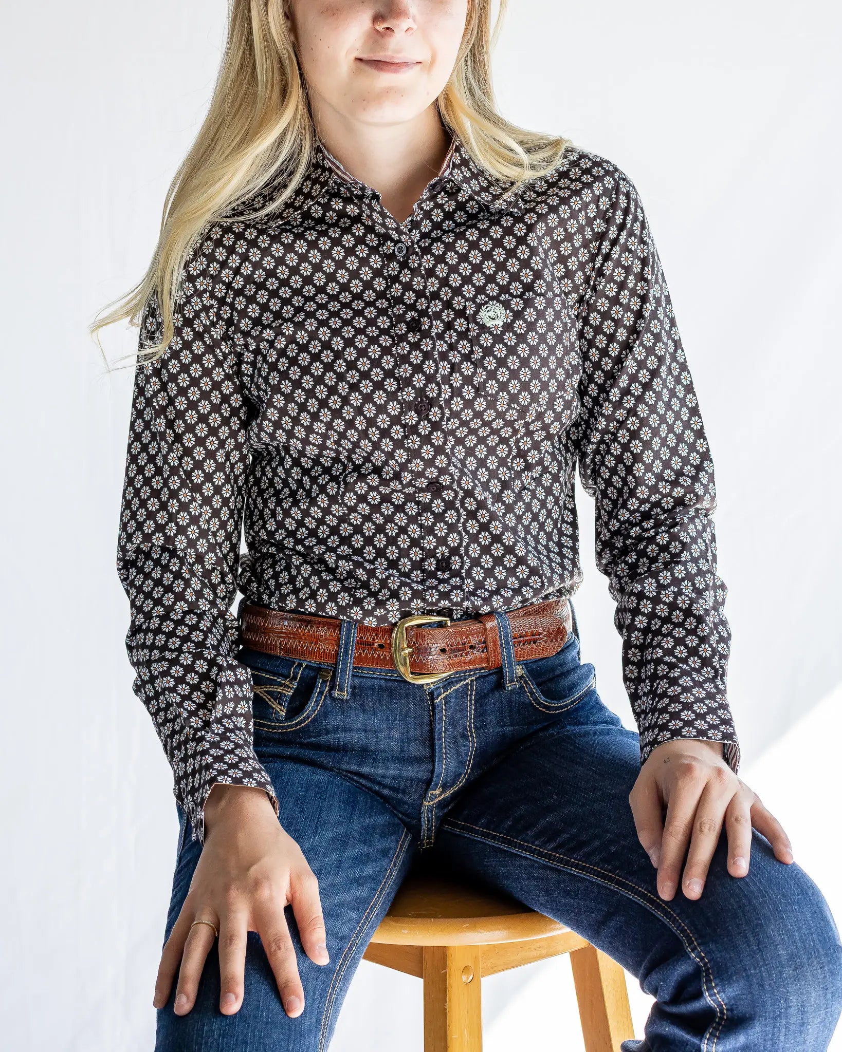 Crafted with a dense brown daisy print and microstripe contrast trim, this standout shirt deserves a top spot in your weekly rotation. Comfortable cotton plain weave construction features brown buttons, an open left front pocket and embroidered CINCH logo.