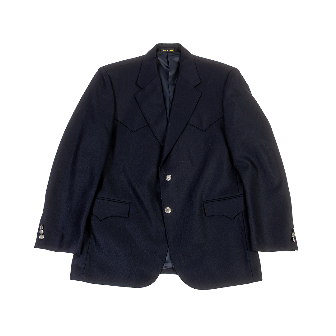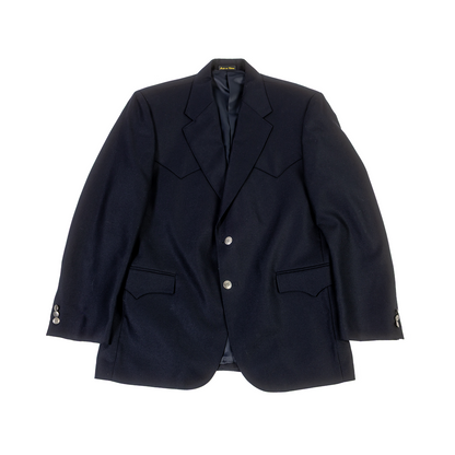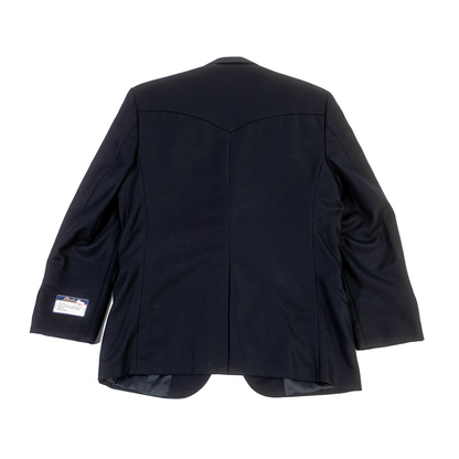This classic navy sports coat takes on a Western style with front and back yokes and silver metal buttons.