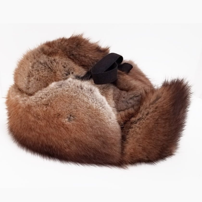 This traditional real fur hat for winter is made from muskrat in Manitoba, Canada. A jockey style, it has a raised stand-up front and 2 earflaps.