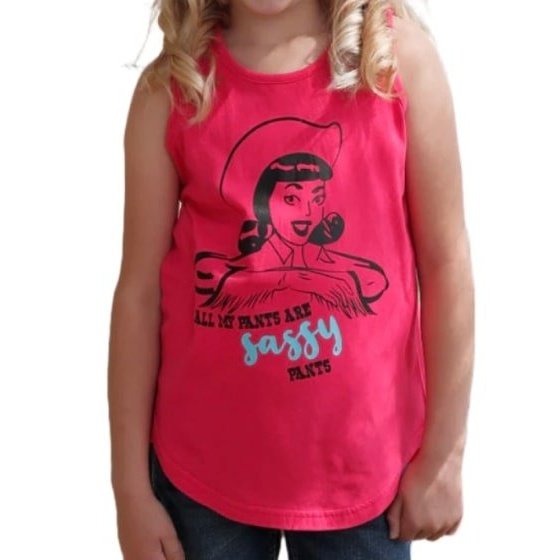 - Graphic: Western cowgirl graphic on front with "All my pants are sassy pants" under graphic.