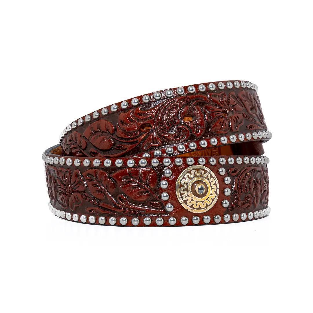 Crafted from premium leather, this belt features intricate hand-tooled floral patterns with a high-gloss finish, bordered by silver-tone stud accents for a bold, polished look. A standout gold-tone gear concho adds a unique touch of western heritage. Pair it with your favorite buckle to create a custom look that’s all your own.