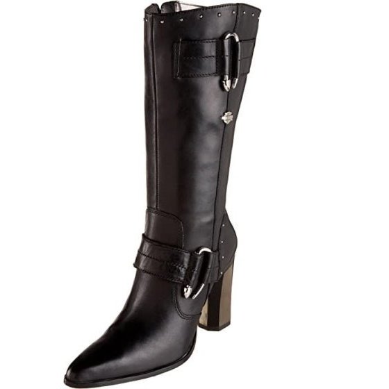 Harley Davidson brings you an elegant women's long boot you can wear anywhere, and just happens to be ready for a bike ride. The below-the-knee design has a shapely fit and is accented with tiny silver studs, overlays, and edgy metal ring details. The pointy toe and mirrored heel beautifully complete the look, perfect for the season's sexy knit skirts and sweater dresses.
