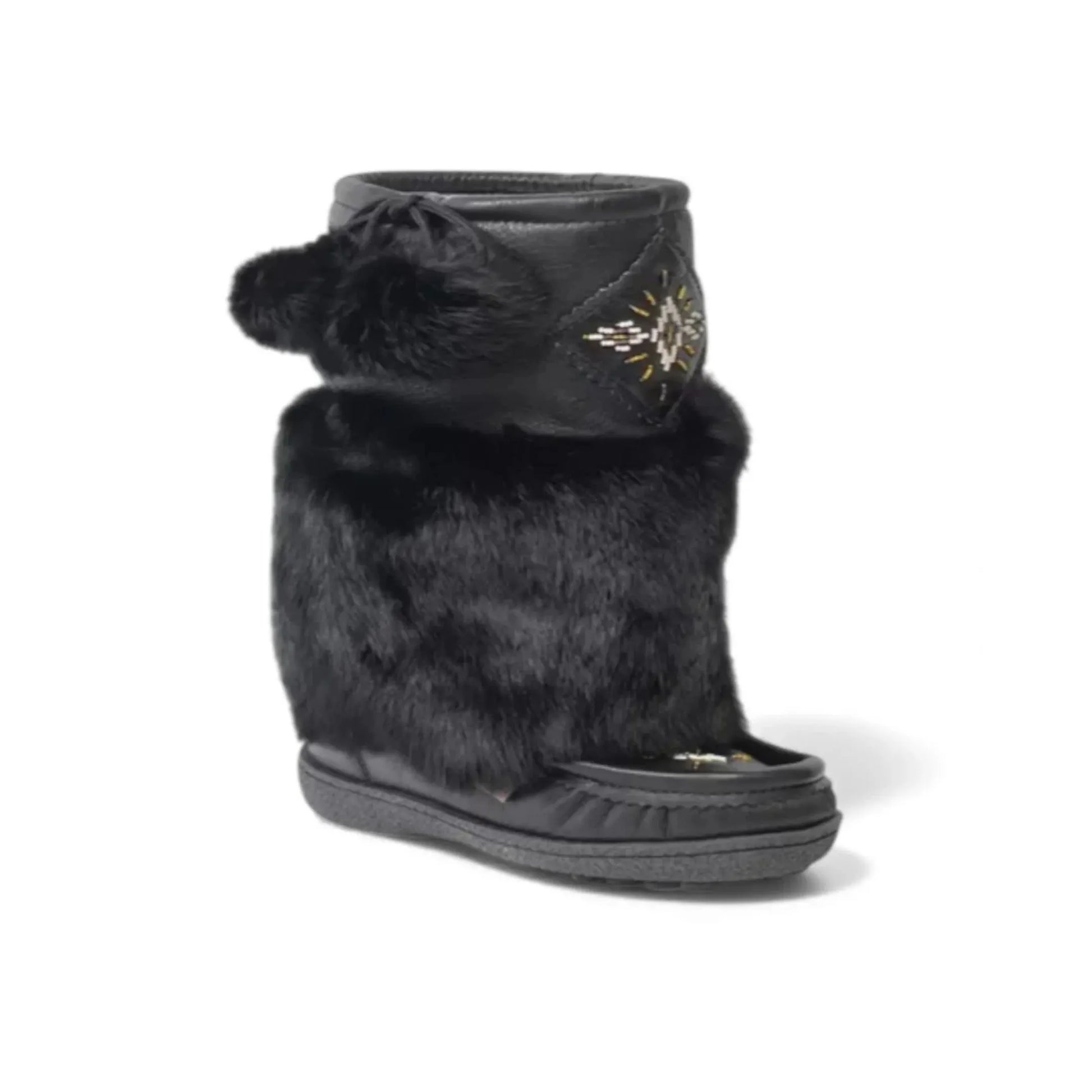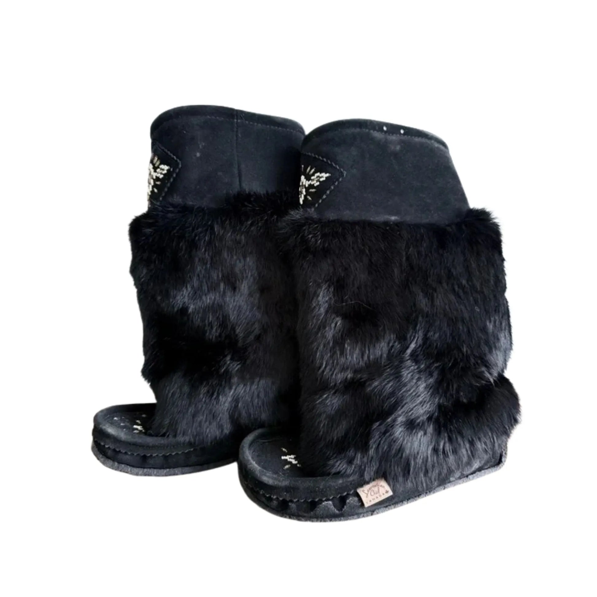 These women's mukluk boots are beautiful, classy and warm, they are lined entirely throughout with a cozy fleece material in the shaft of the boot and the footbed. These ladies mukluks are Entirely Canadian made from genuine suede leather. These stylish women's mukluk boots have a matching real rabbit fur collar around the shaft of the boot and pom poms. They have a durable outdoor Italia rubber sole that is sewn higher on the sides which makes the stitching more durable, and the bottom of the Italia sole has a textured grip design. These ladies mukluks are mid-calf height, approximately 13" from the ground up and the opening is between 14" and 16" circumference. The foot part of the boot is made of water-resistant suede.