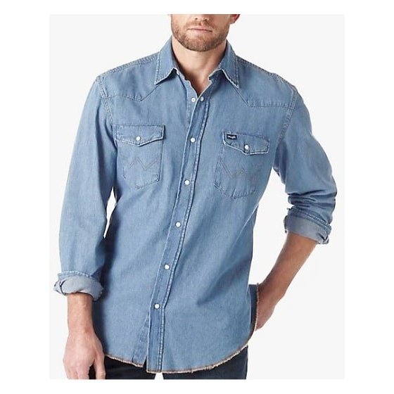 One wardrobe staple a cowboy should never be without is a work shirt that can hold its own. Every Cowboy Cut® work Western denim snap shirt comes Western front and back yokes, a spread collar, two spade flap snap pockets, the Wrangler® logo riser label on the left pocket, and our decorative 'W' stitching.