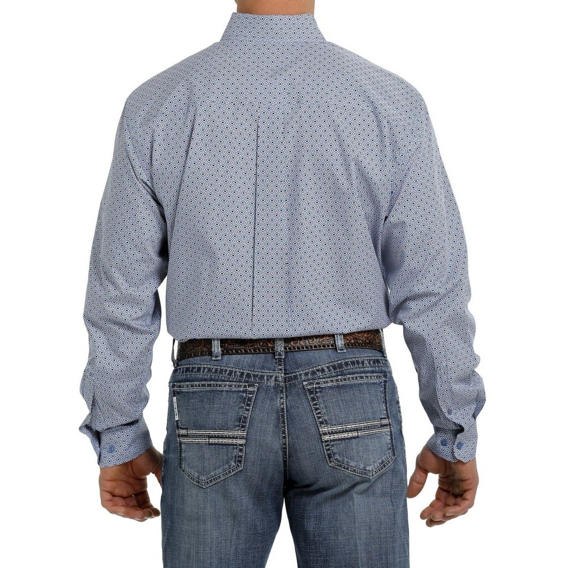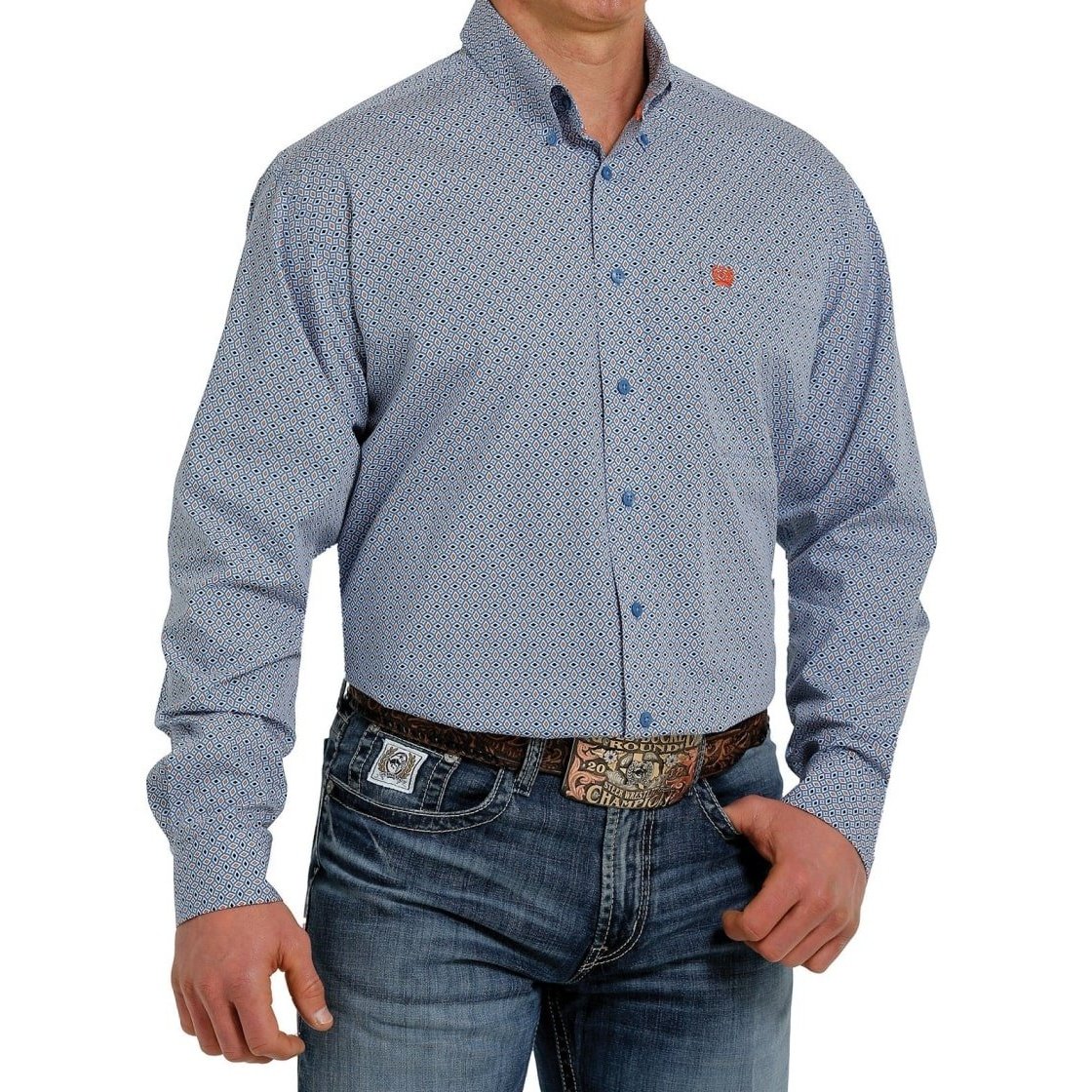 Check out this Cinch classic classic cotton plain weave shirt featuring a modern geometric print, an open left front pocket with embroidered logo and blue buttons. More of a casual goes-with-anything style, since it does not have Western yokes.