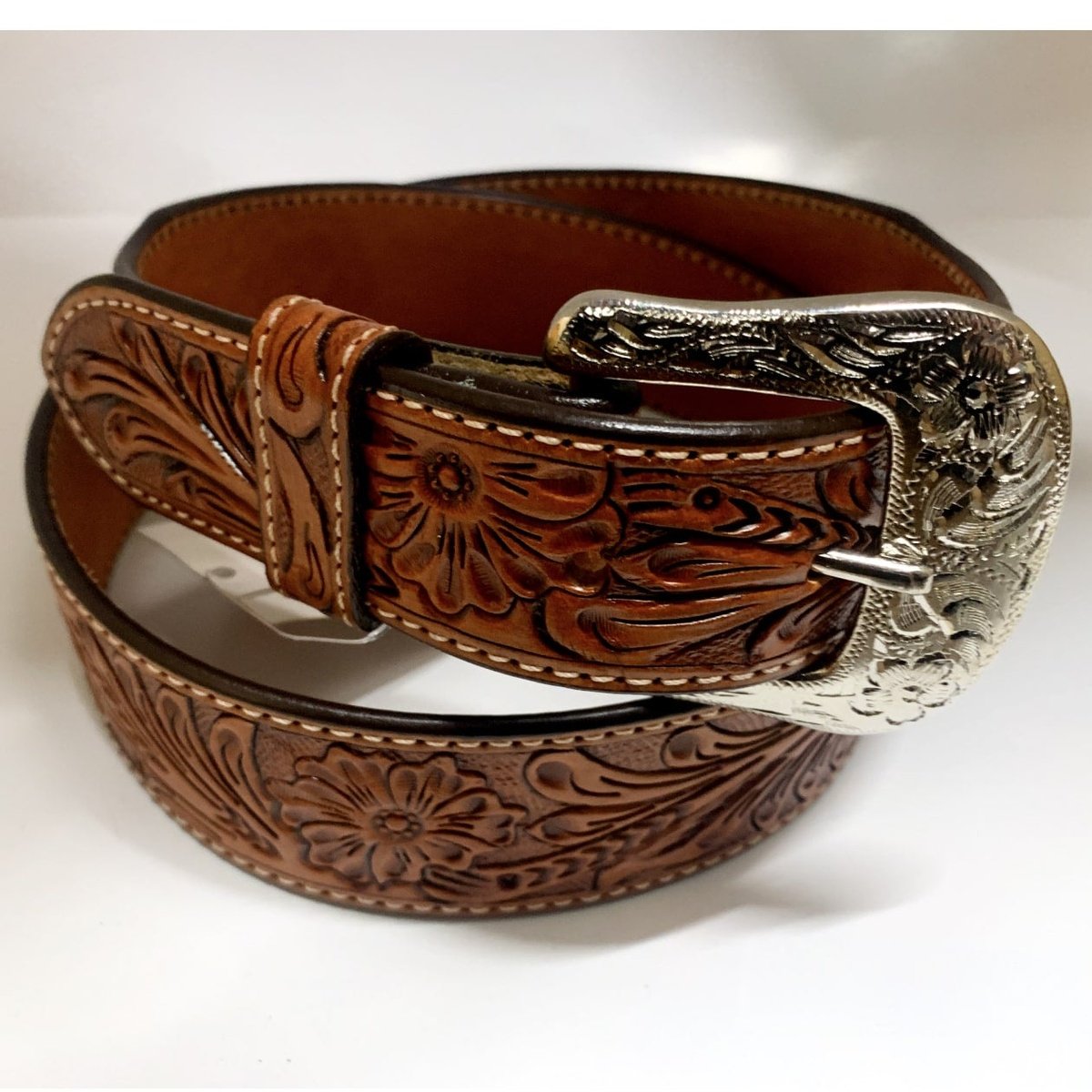 This men’s high quality leather belt features tooled leather in a mid brown. The buckle is removable for a quick change in your look.