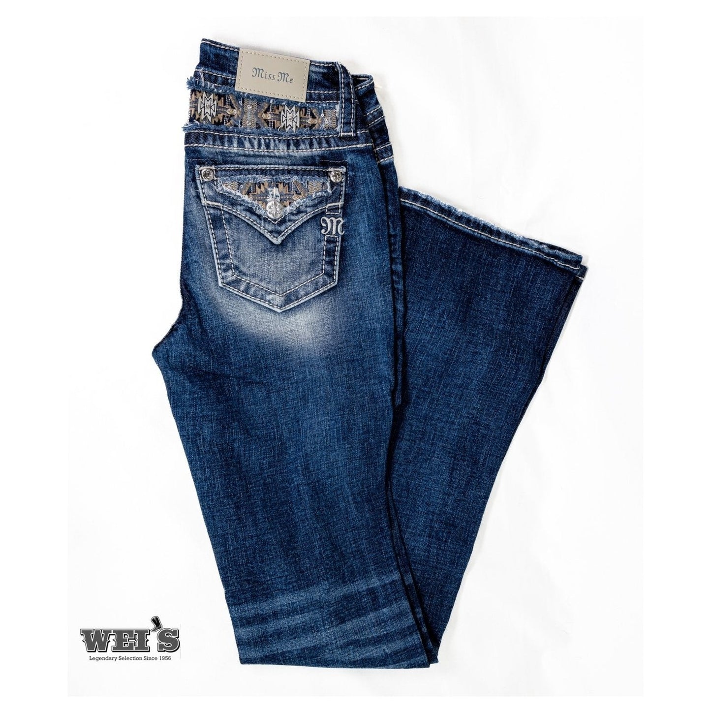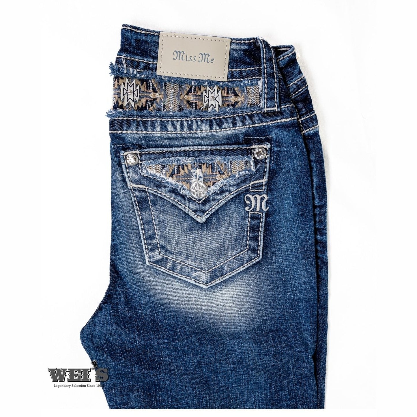 This pair has had all the style you expect from Miss Me. Check out the Southwest influence on the back fabric.