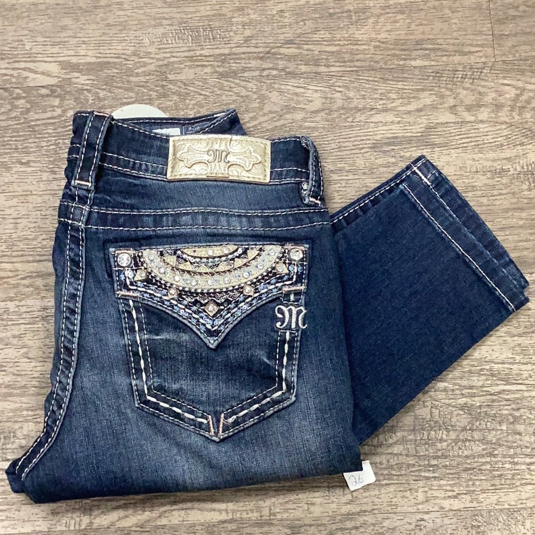 Mid rise skinny detailed with whiskering, geometric pattern, and a faux flap pocket design with rhinestone rivets.