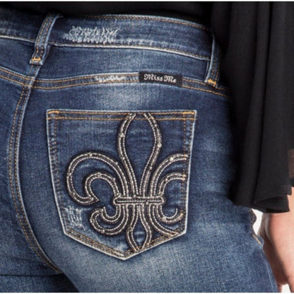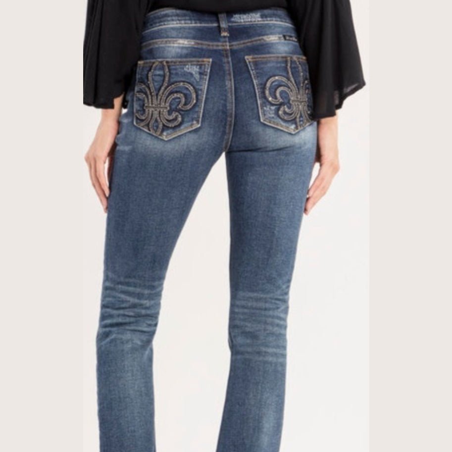 - Features: Boot cut style. Embellished fleur de lis with royal colors. Embellished diamonds, rivets and rhinestones. Contrast stitching. 5 fully functional pockets. Whiskering and fading. Shiny threading.