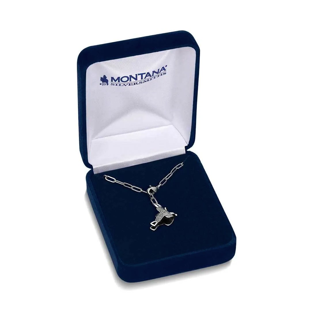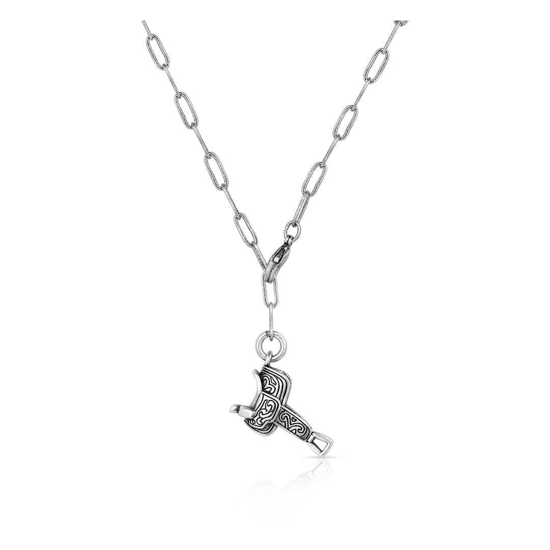 The Back in the Saddle Necklace takes a classic Western symbol of the saddle to create this simple and timeless design that can be dressed up or down. The pendant is a silver tone sculpted saddle with intricately etched details. The brushed finish creates a rustic and vintage look. A bold 21.25 inch paperclip chain can be adjusted to any length for multiple ways to wear. Show your style with this versatile necklace, wear it on its own, or layer it with other pieces, either way it is the perfect addition to your wardrobe.