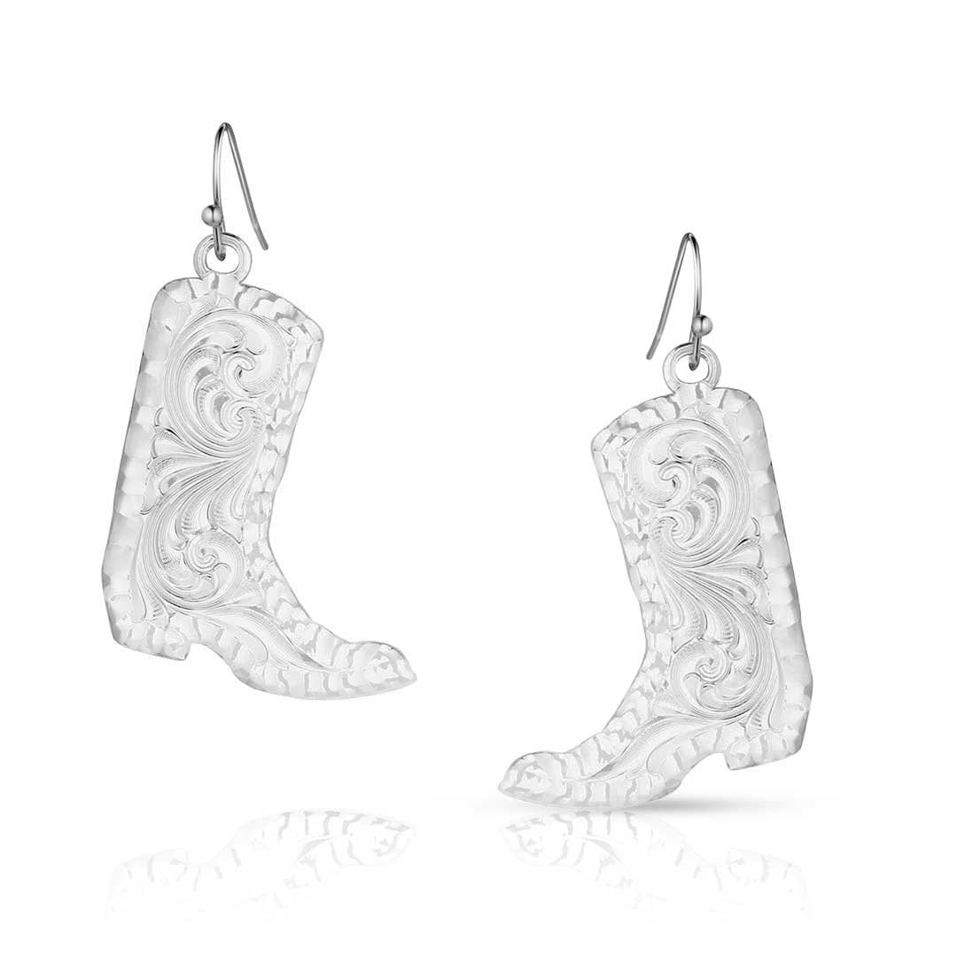 Wear these stunning earrings for a fun and bold Western look. The bright silver tone earrings are a silhouette of a cowboy boot that dangles from hypoallergenic French wires. Bright cut engraving covers the center of the bright silver tone boot. A chiseled edge adds to the design and complements the piece.