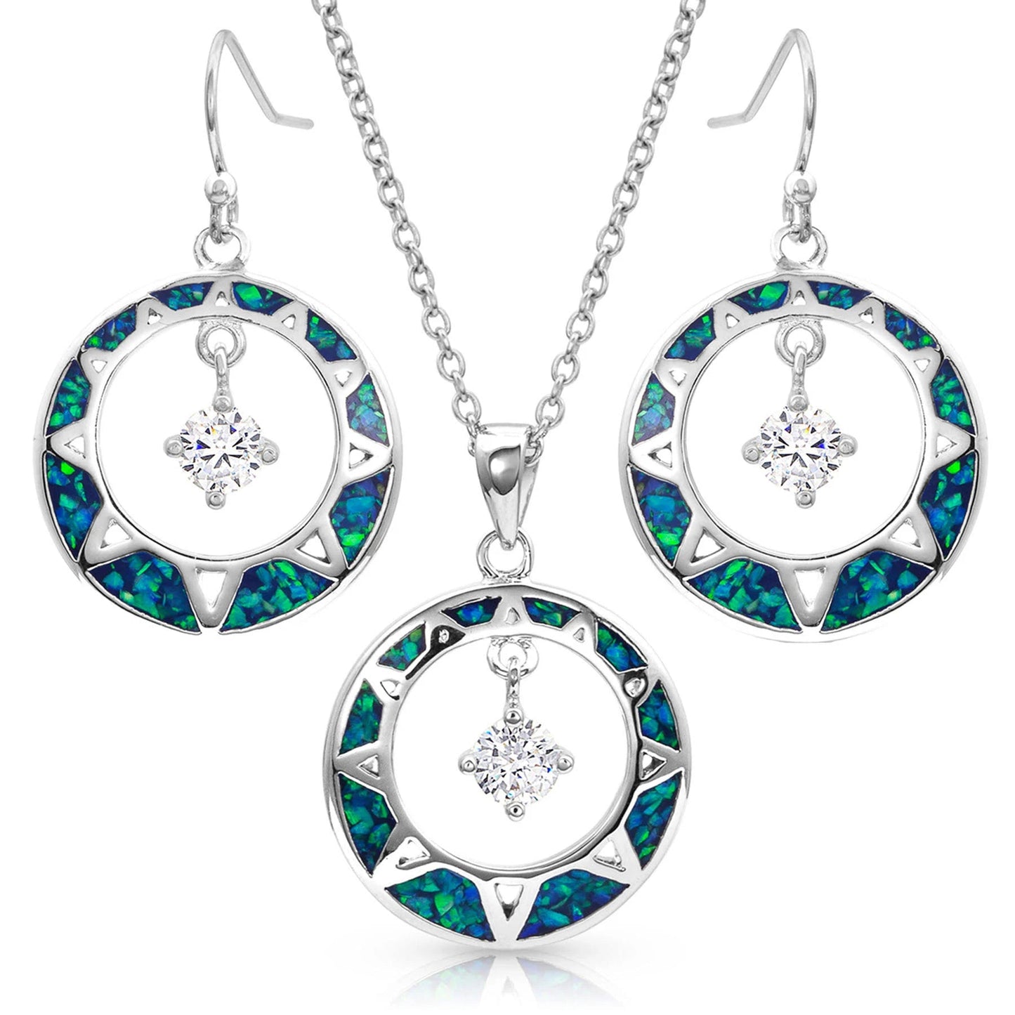These sparkly horseshoe shaped earrings hang from a stainless steel, hypoallergenic French hook. One side of the horseshoe fastens to the bottom of the hook and dangles freely, showing off the slim crystal-lined horseshoe detail. A blue opal horseshoe is held within the larger one, tilted ever-so-slightly. These earrings shine in a silver-finish.