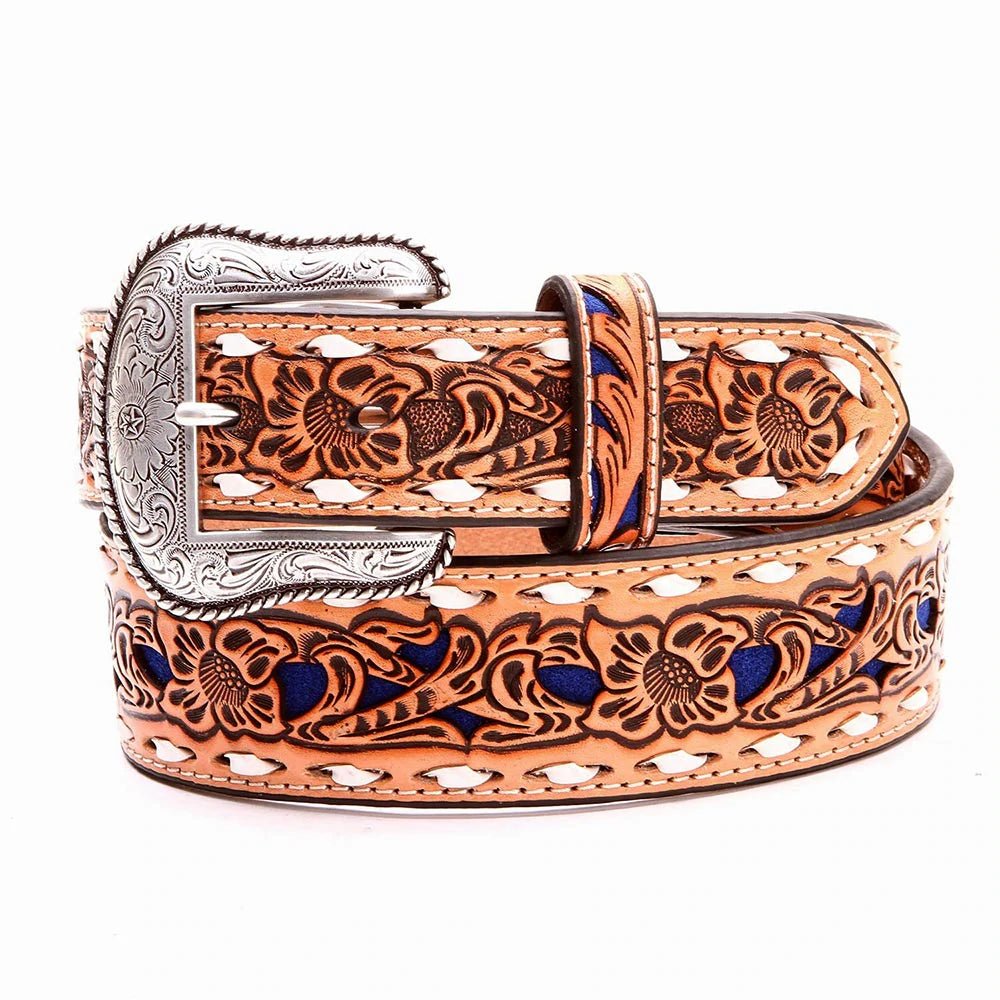 This Nocona Blue Floral Embossed Belt is made with genuine leather upscale quality. It features a royal blue inlay among a floral embossed pattern.