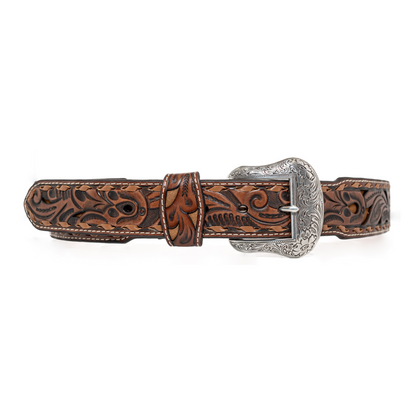 Durable enough for the workday, but stylish enough for evenings, this Nocona mens belt by M&F Western Products is made of genuine leather and features a scrolled pierce strap with a lighter tan underlay. The belt is tapered and the edges have a leather lacing. The silver engraved buckle is removable should you want to create your own style. Great belt for the cowboy who wants to look his best. Available in sizes 32-46.