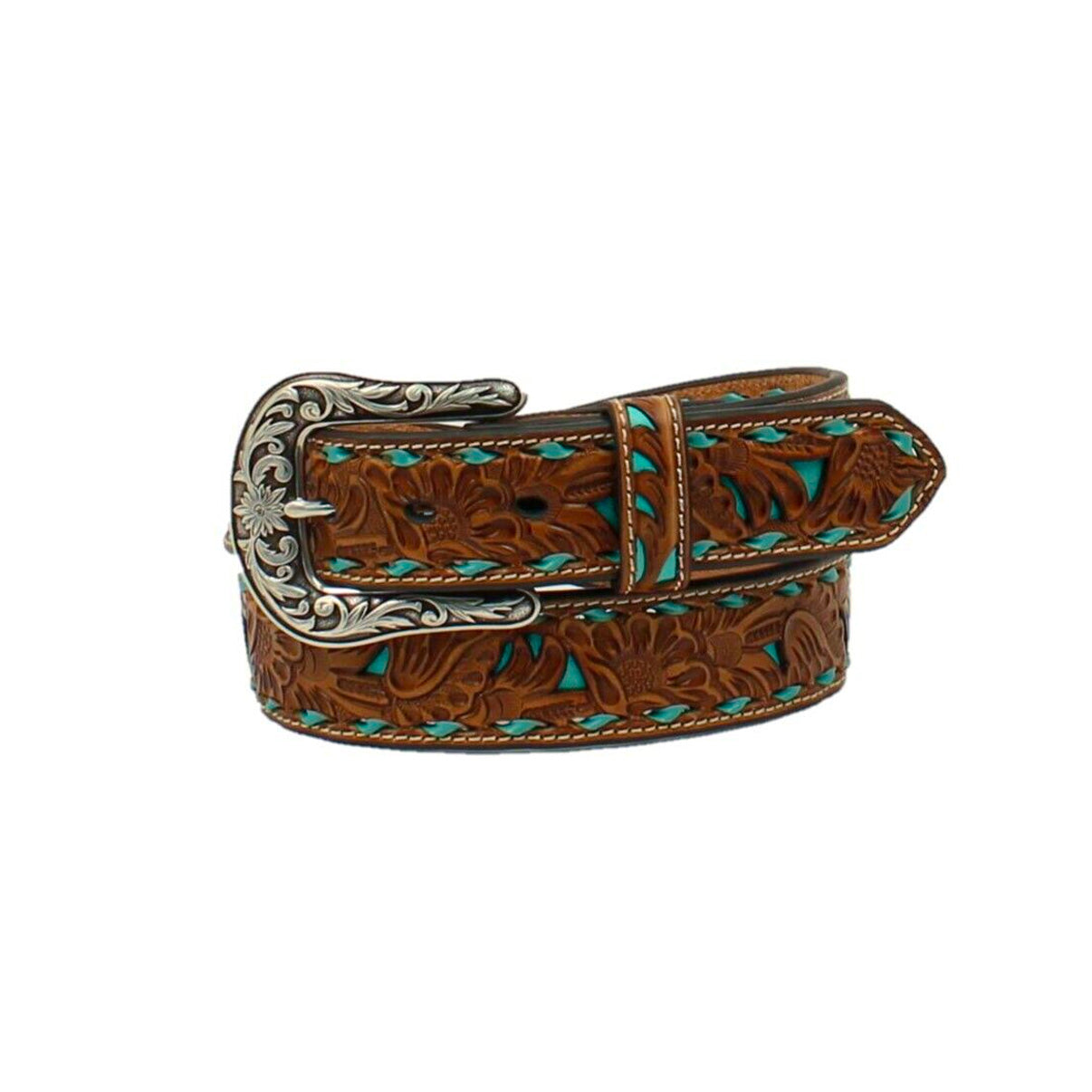 This belt by Nocona is a brown embossed with turquoise inlay genuine leather. The antique silver embossed buckle is detachable to be replaced by your favorite buckle.
