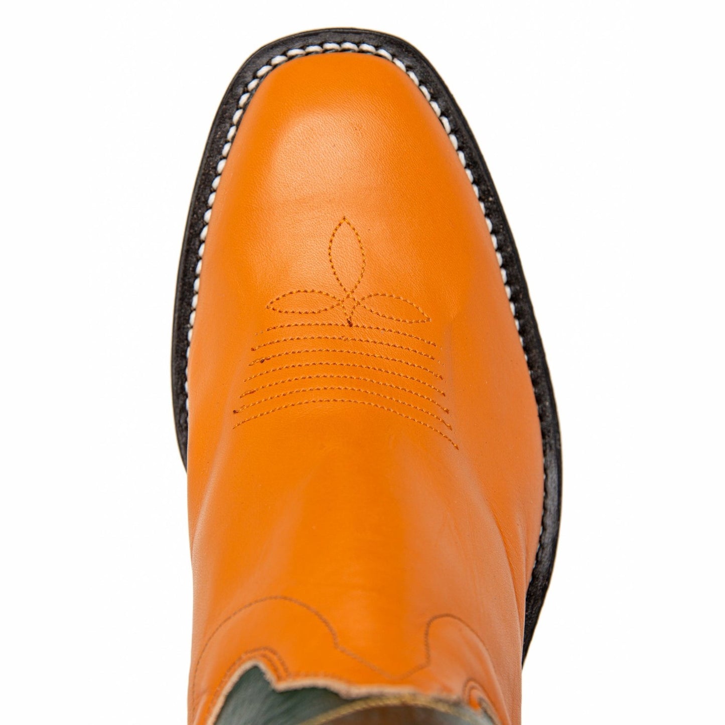 These Olathe boots get attention. The riding heel is slanted for maximum stability in the stirrups. The toe is an "L" toe that slips into the stirrup easily. The sole and heel are leather, and a rubber cap is added to the heel for anti-slip stability.