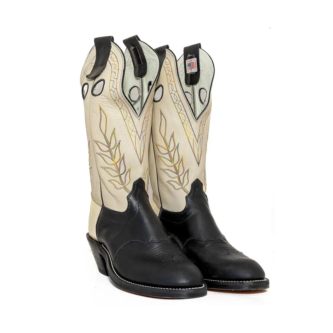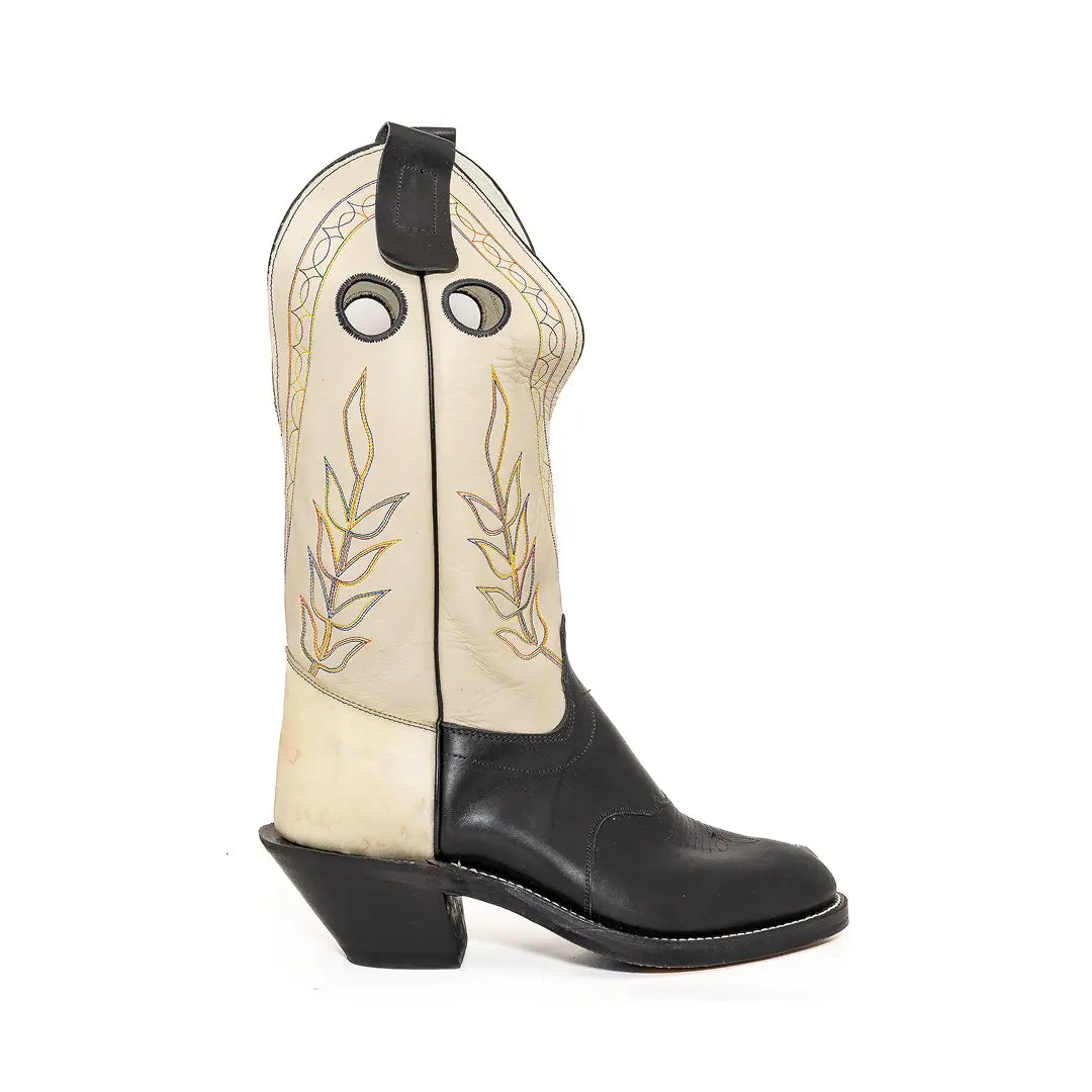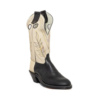 These classic Olathe boots are popular with riders. The riding heel is slanted for maximum stability in the stirrups. The toe is a traditional slightly rounded "U" toe that slips into the stirrup easily. The sole and heel are leather, and a rubber cap is added to the heel for anti-slip stability. The heel counter is rawhide, adding a tough surface for those riders who add spurs.