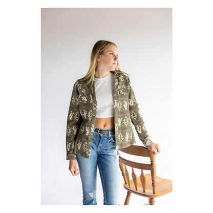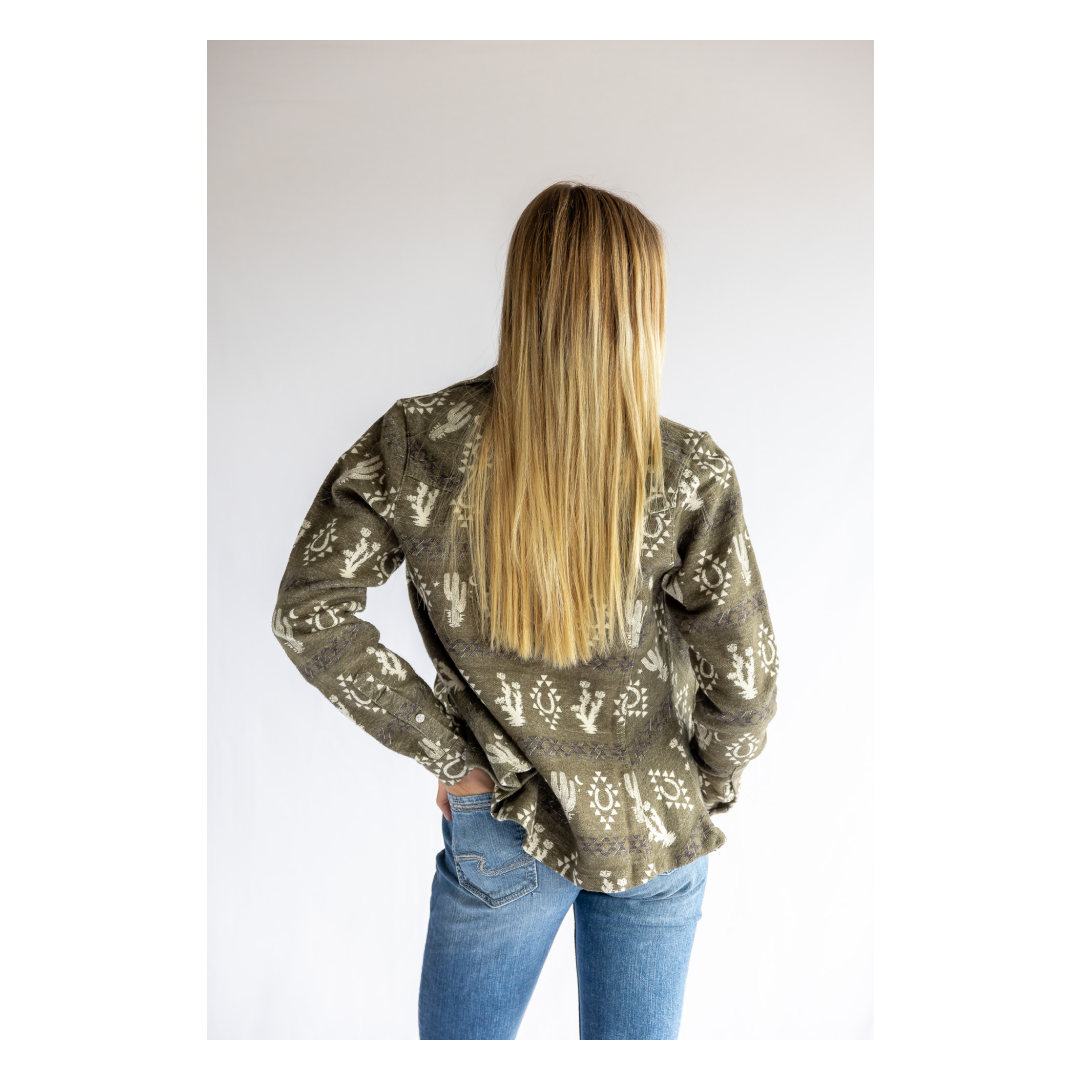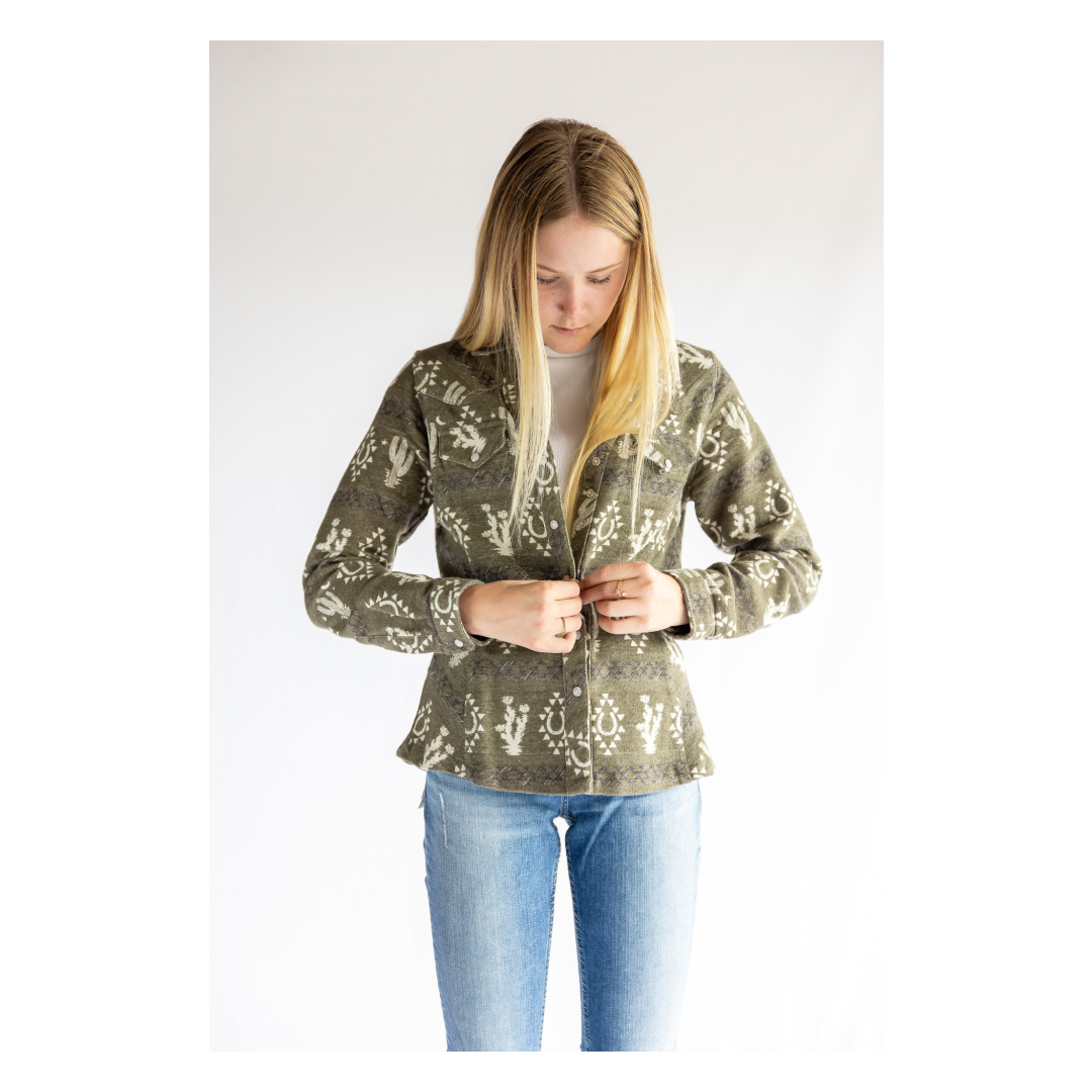 Nothing says a cowgirl classic like Outback cactus-covered Fay Shirt! This 100% cotton shirt is brushed to give you a soft, not cactus-like, feel. Features include adjustable cuffs, a v-neck opening, and a modesty snap to keep you looking your best!
