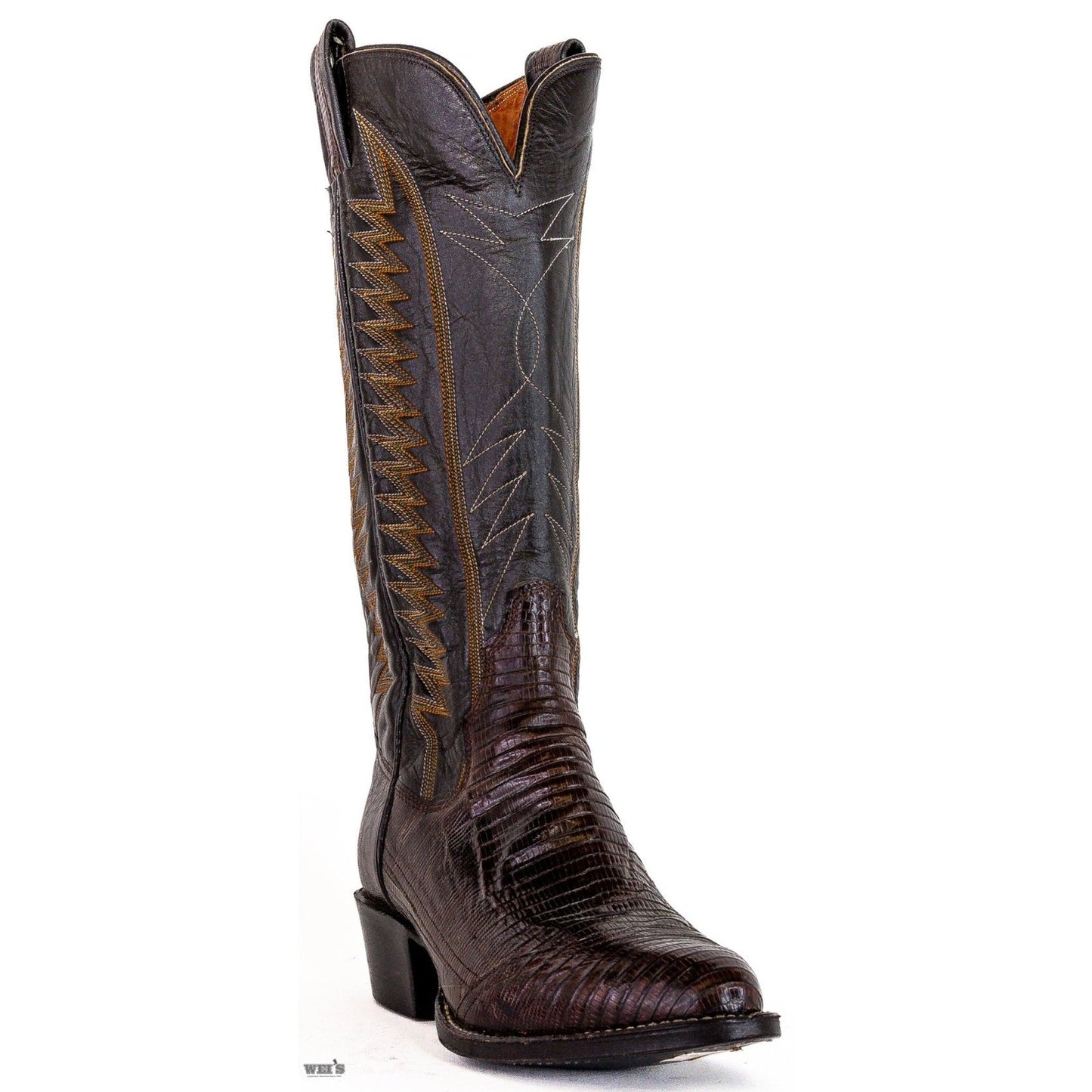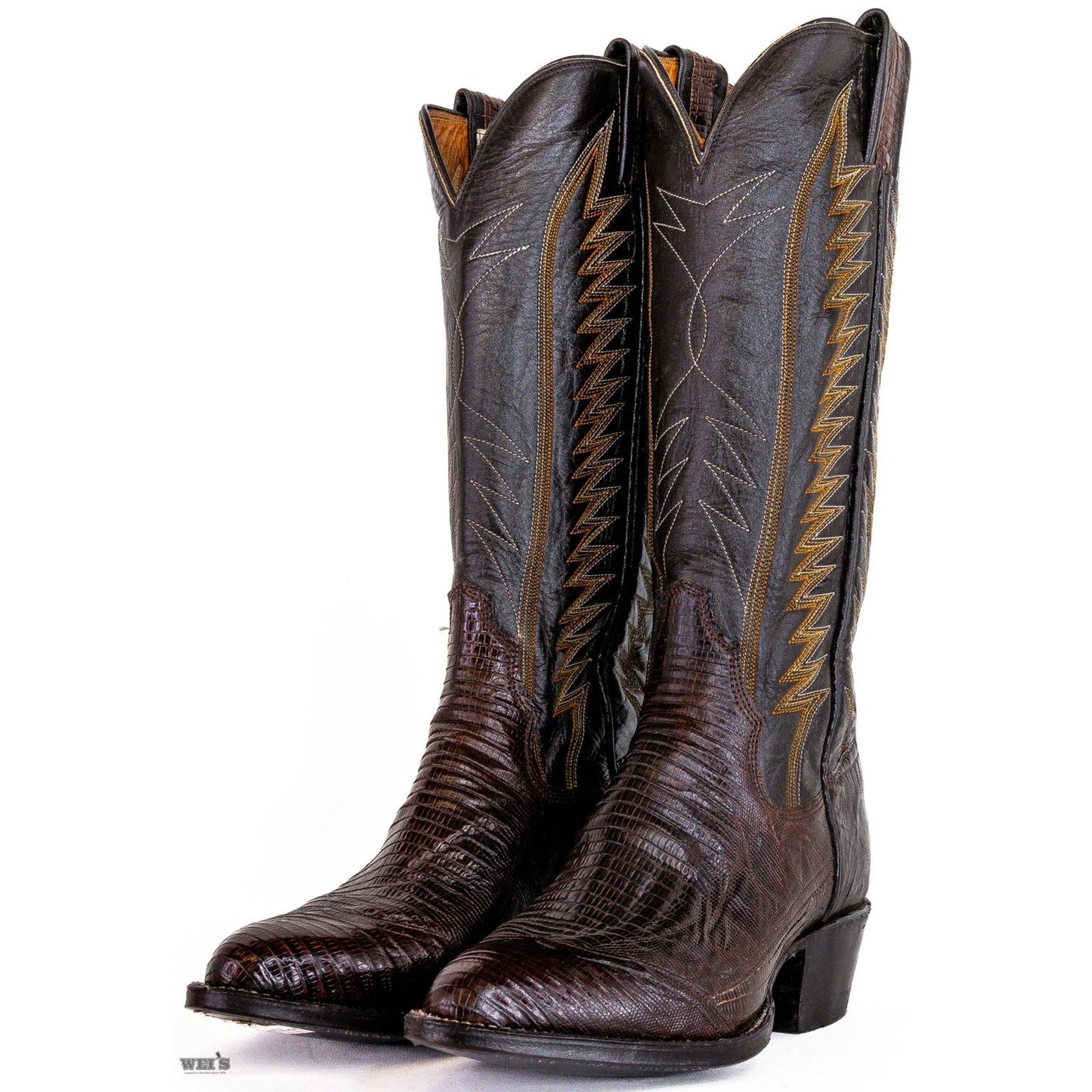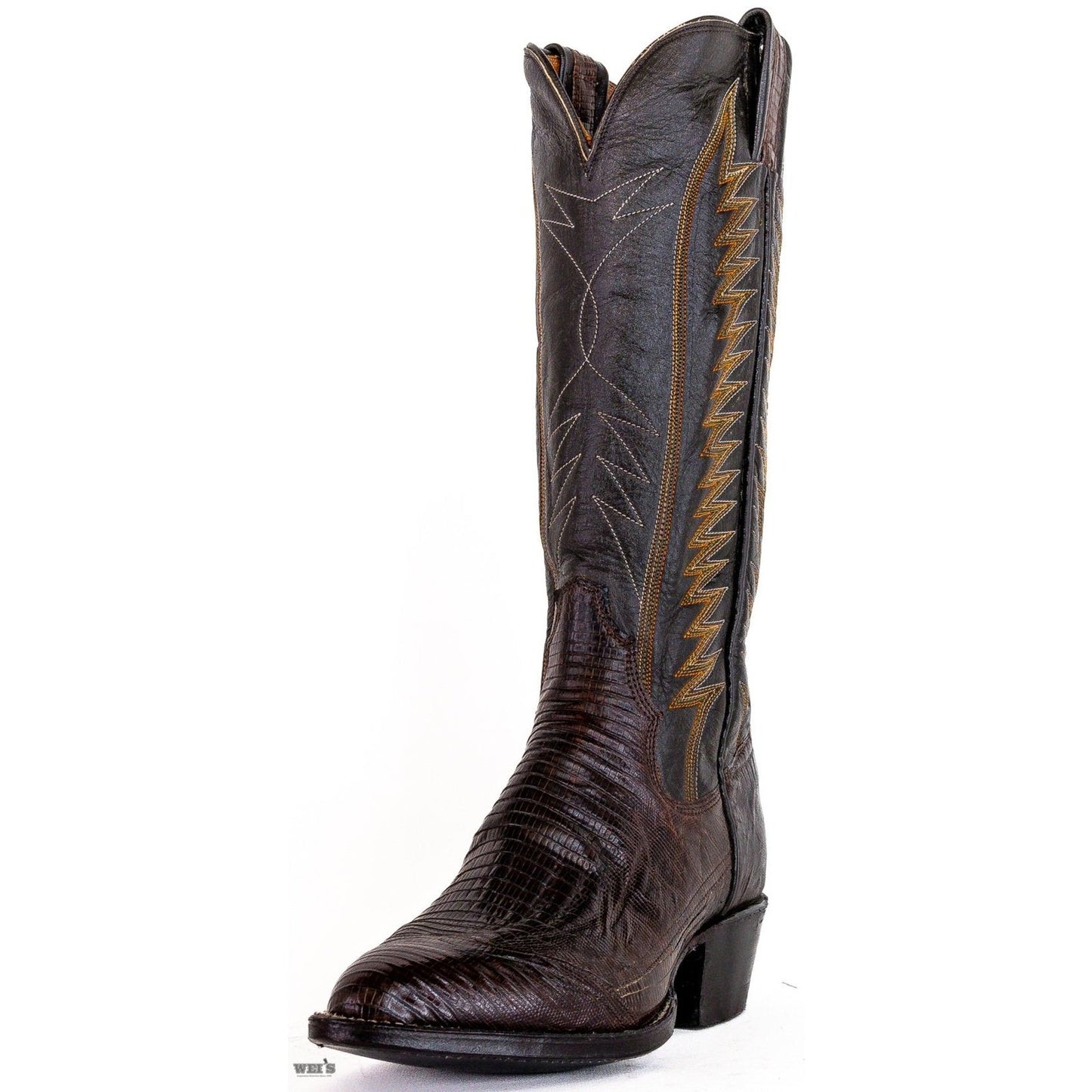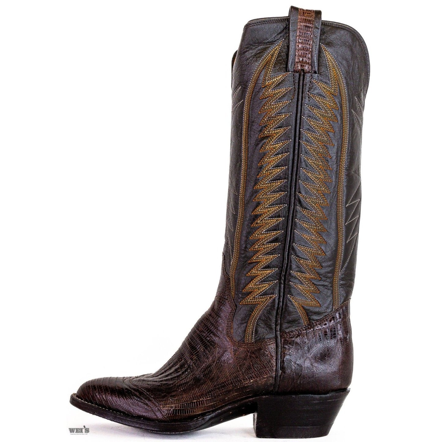 These Panhandle Slims come with classic dark chocolate brown lizard, and classic cowboy riding heel and R toe.