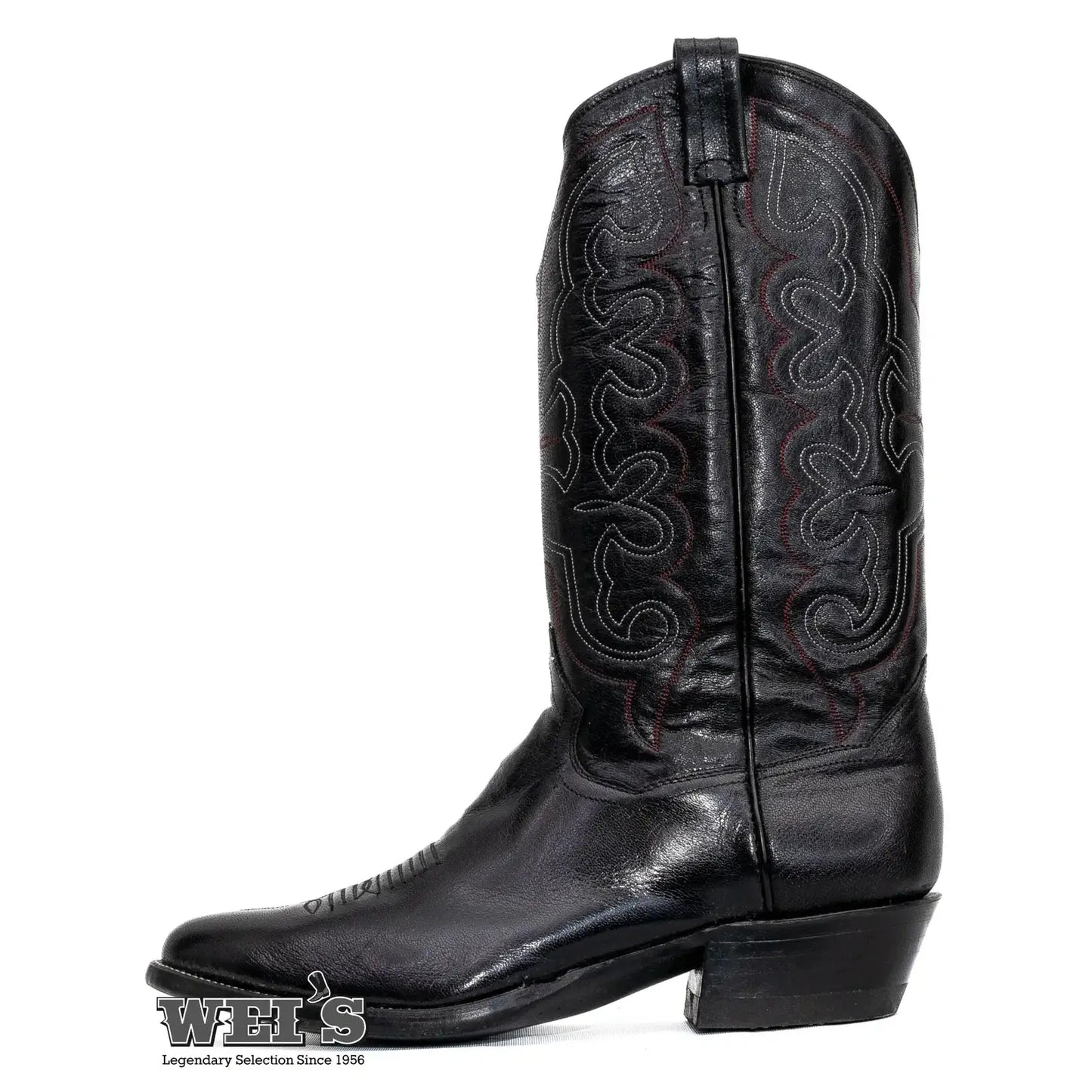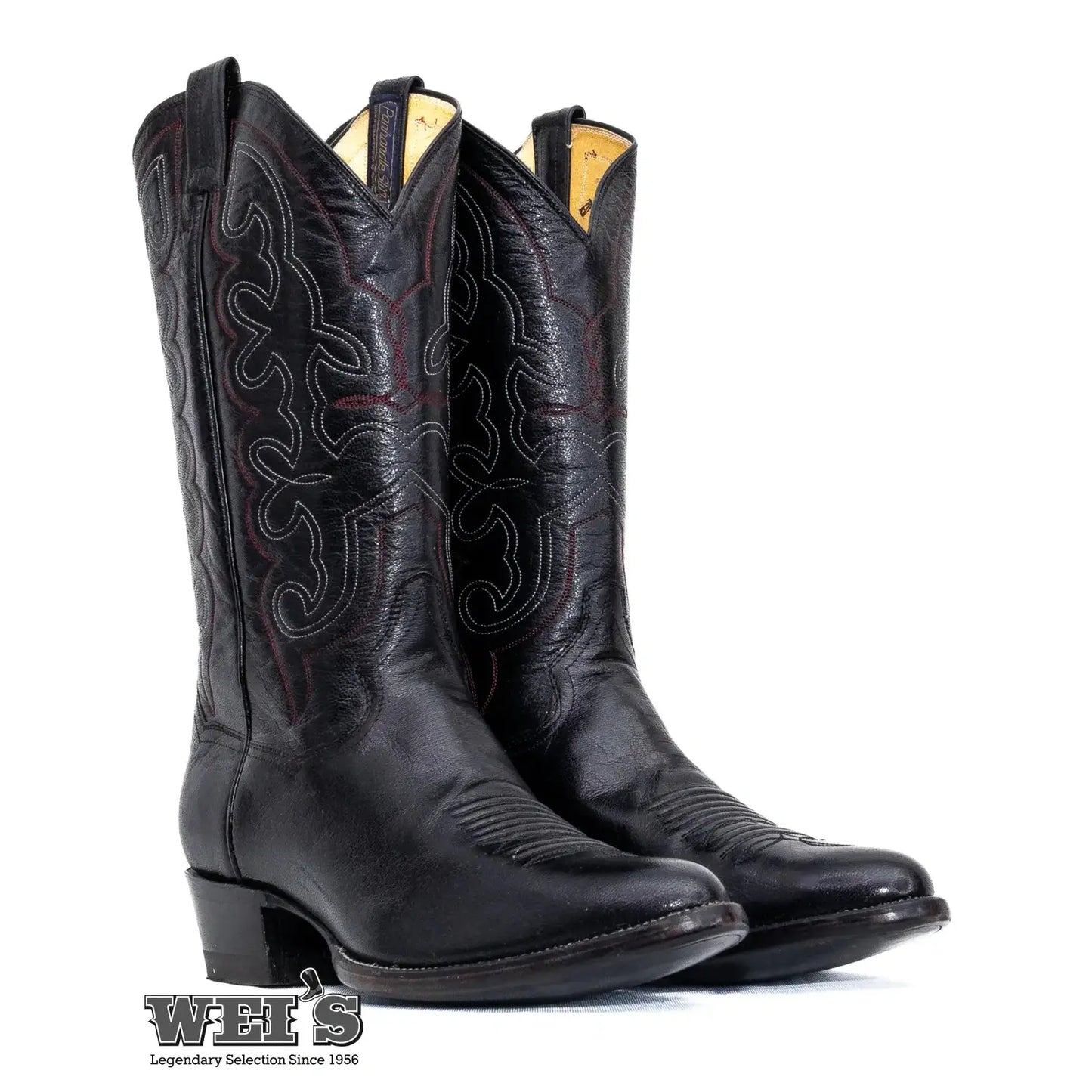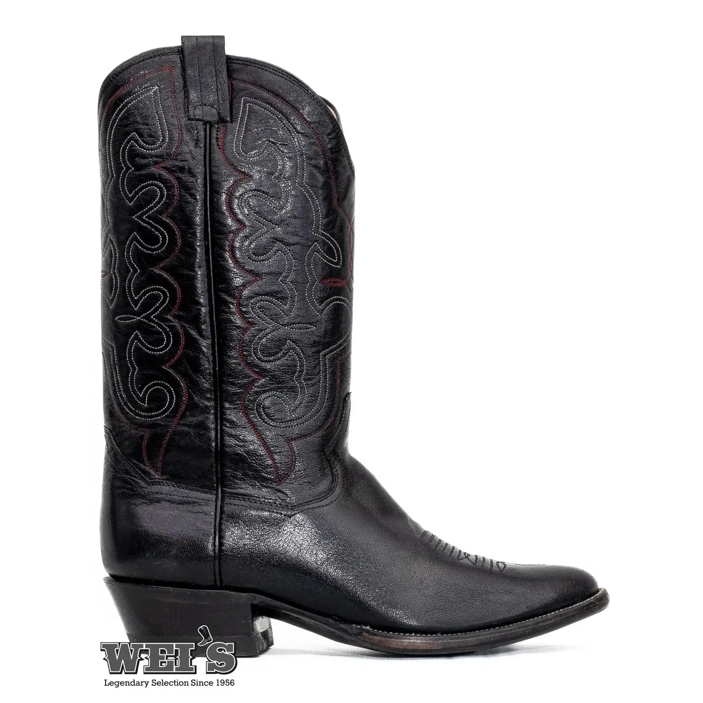 Panhandle Slim 21505 Antique Goat boots feature a goat leather shaft with red and white embroidery, offering a vintage yet modern style.