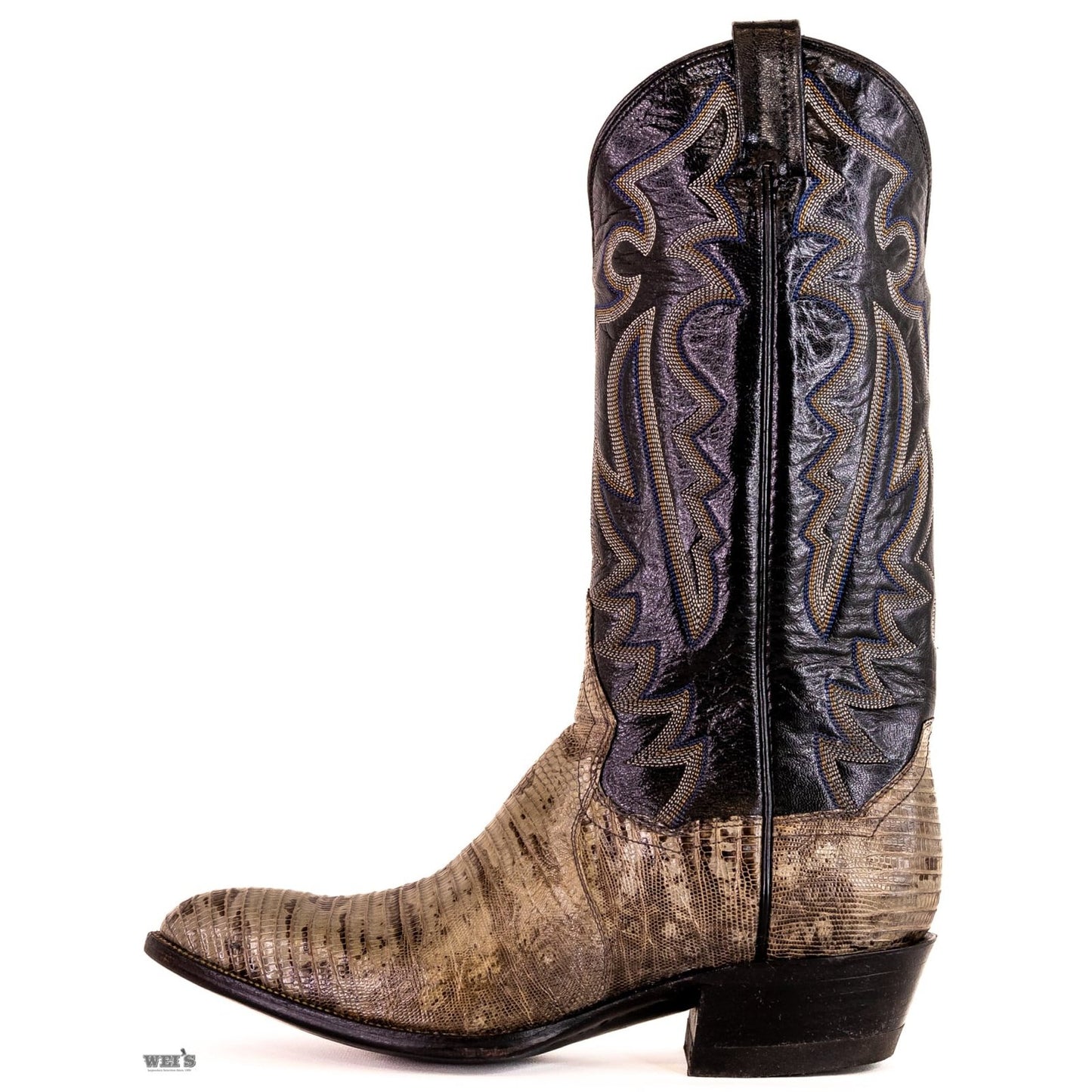 These Panhandle Slim boots feature a lizard vamp with grey tones, and a black cowhide shaft with colourful embroidery. The grey makes these look broken in already, they'd look great with a pair of broken-in jeans.