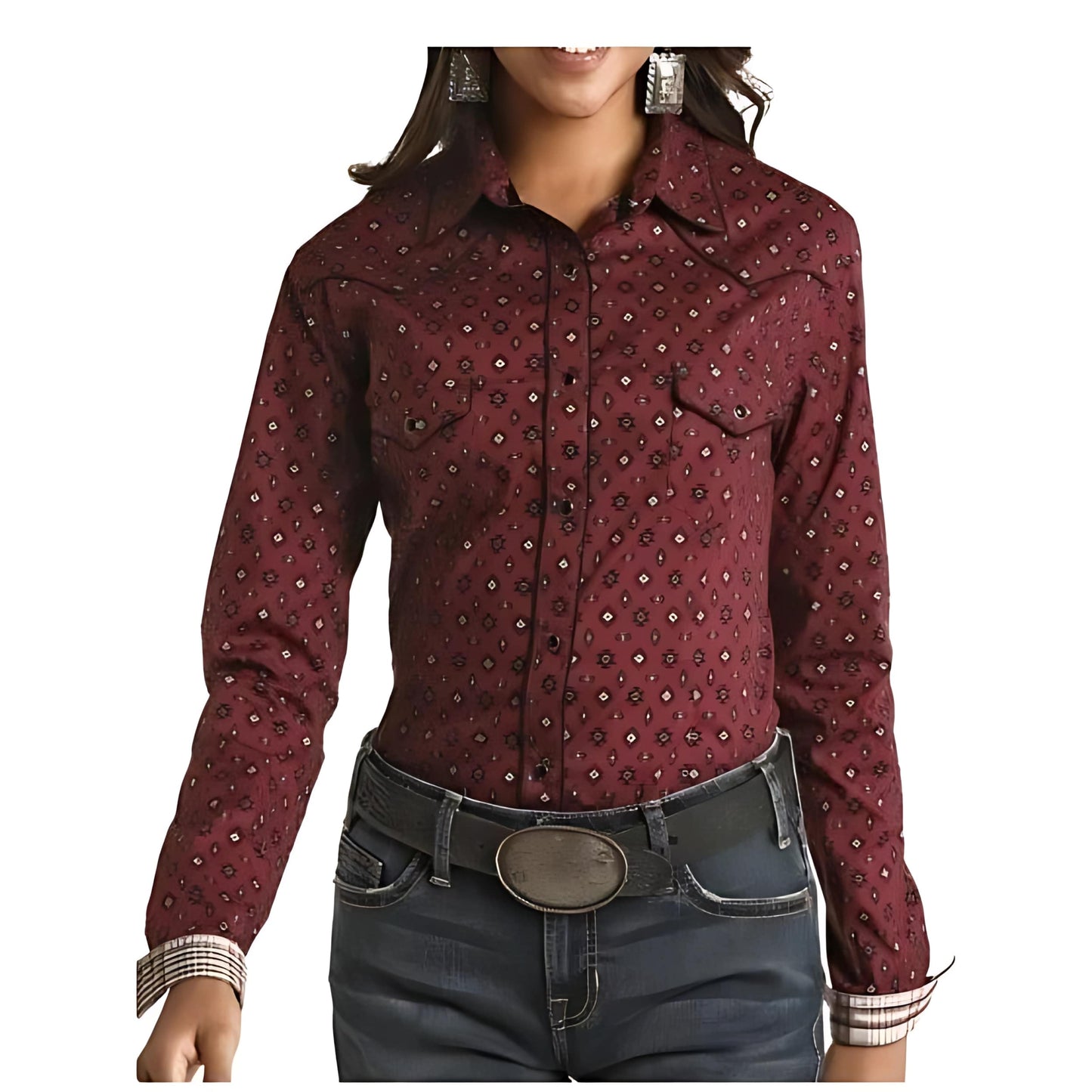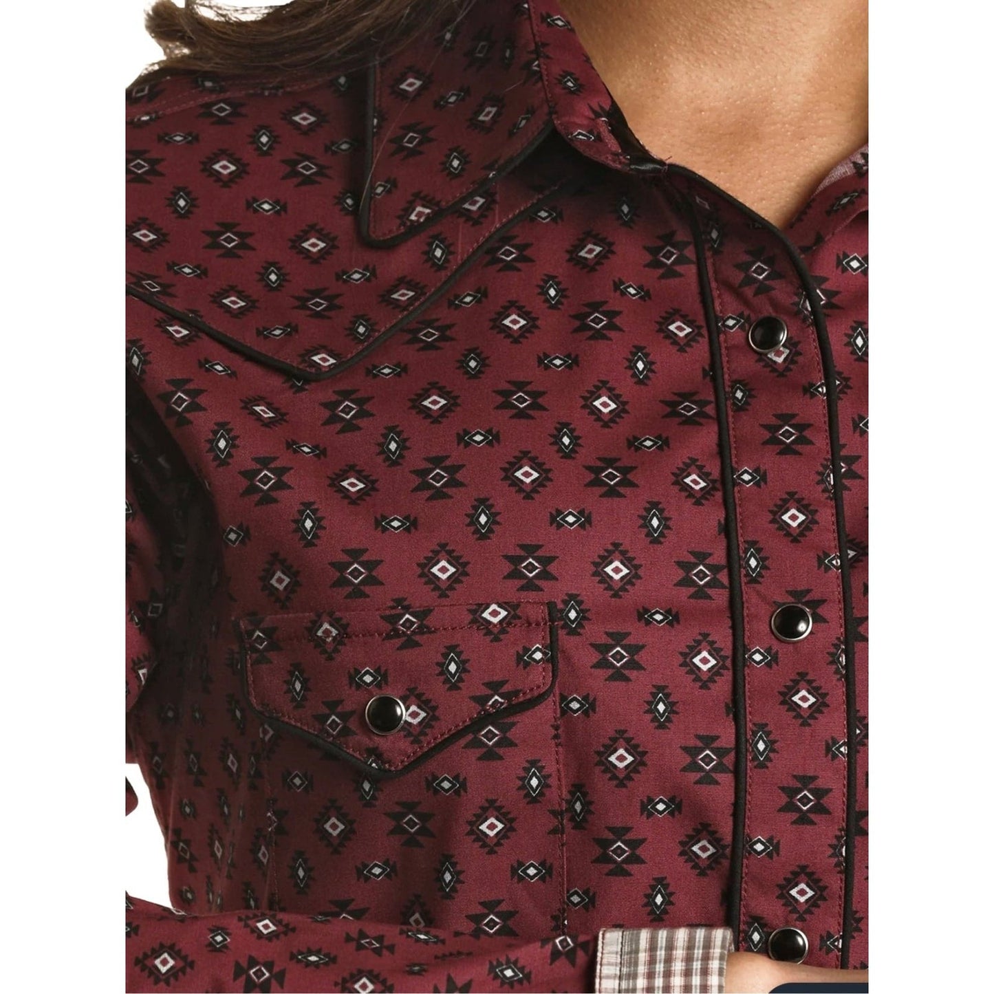 Panhandle Women’s Shirt Long Sleeve Snap Maroon Aztec
