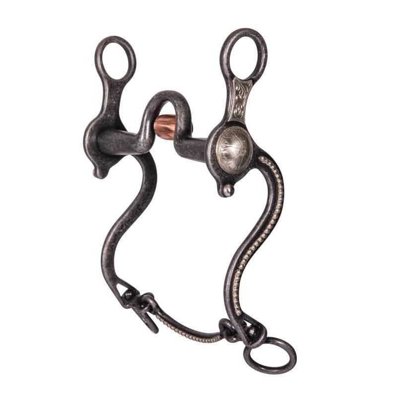 The cheek is 8” Mouth: 5" Port w/roller: 1 3/4"