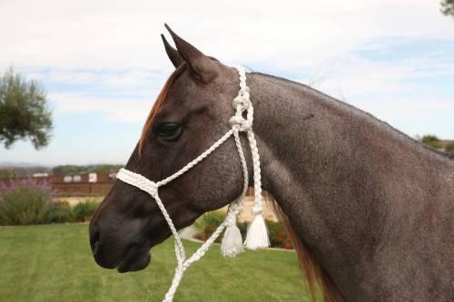 A braided soft yet sturdy rope halter that features a flat nose and comes complete with a matching ten foot lead. Beaded nose band gives a fun fashion flare to the noseband.