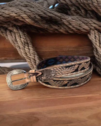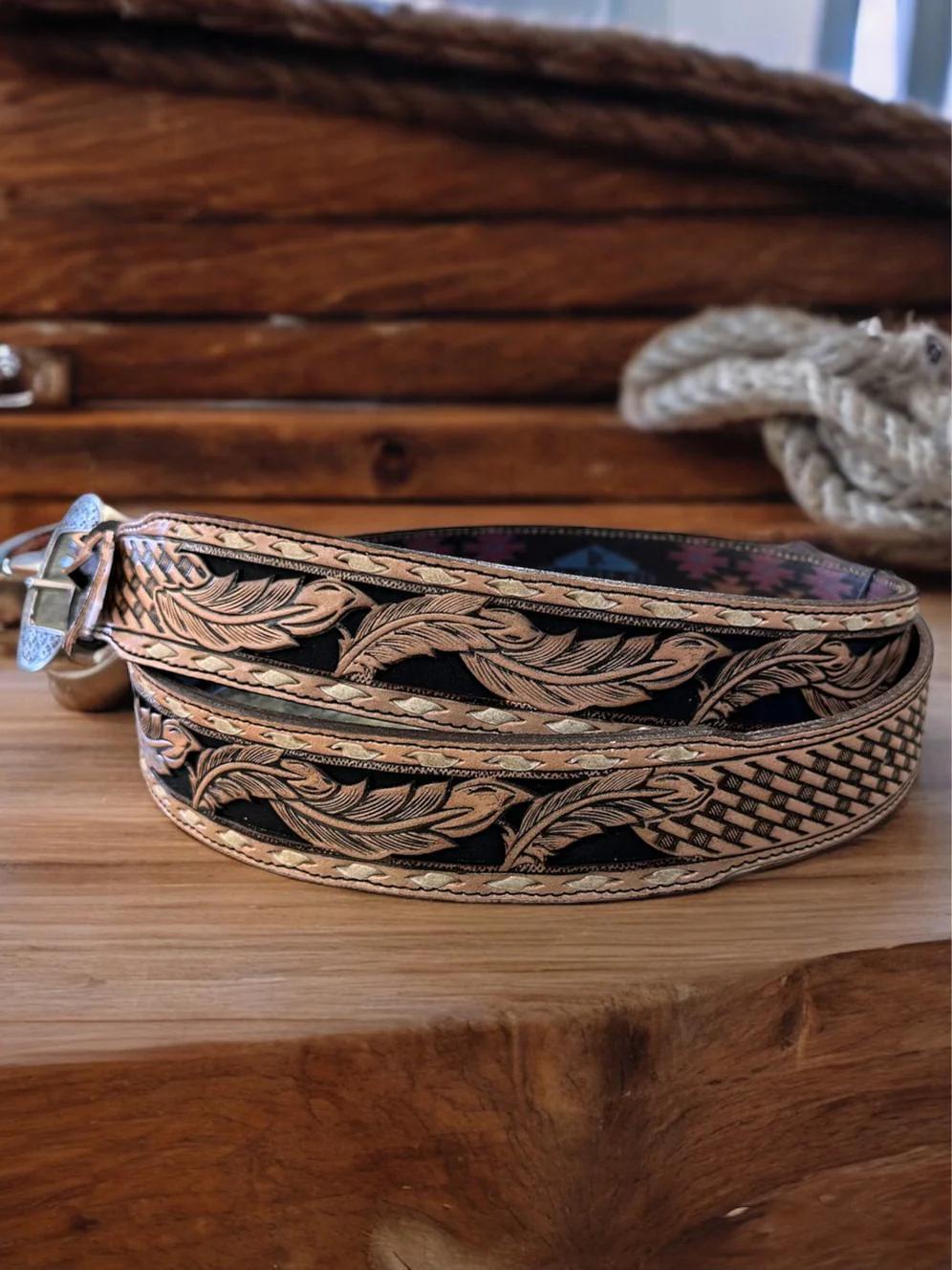 This men's belt features a tooled leather basketweave pattern with feather motif and rawhide whipstitch. Back printed with signature southwest pattern.