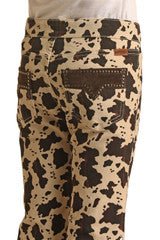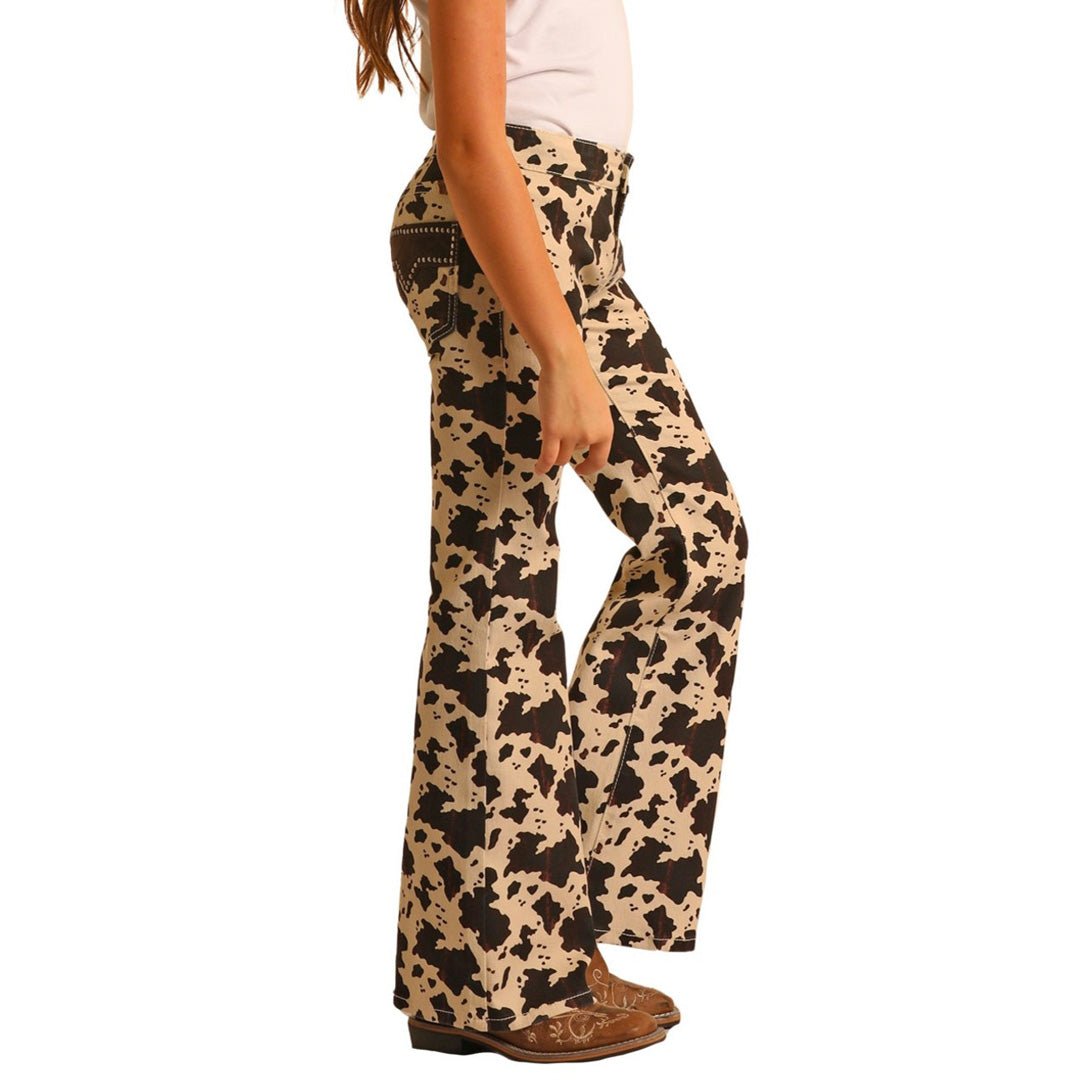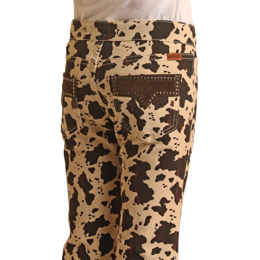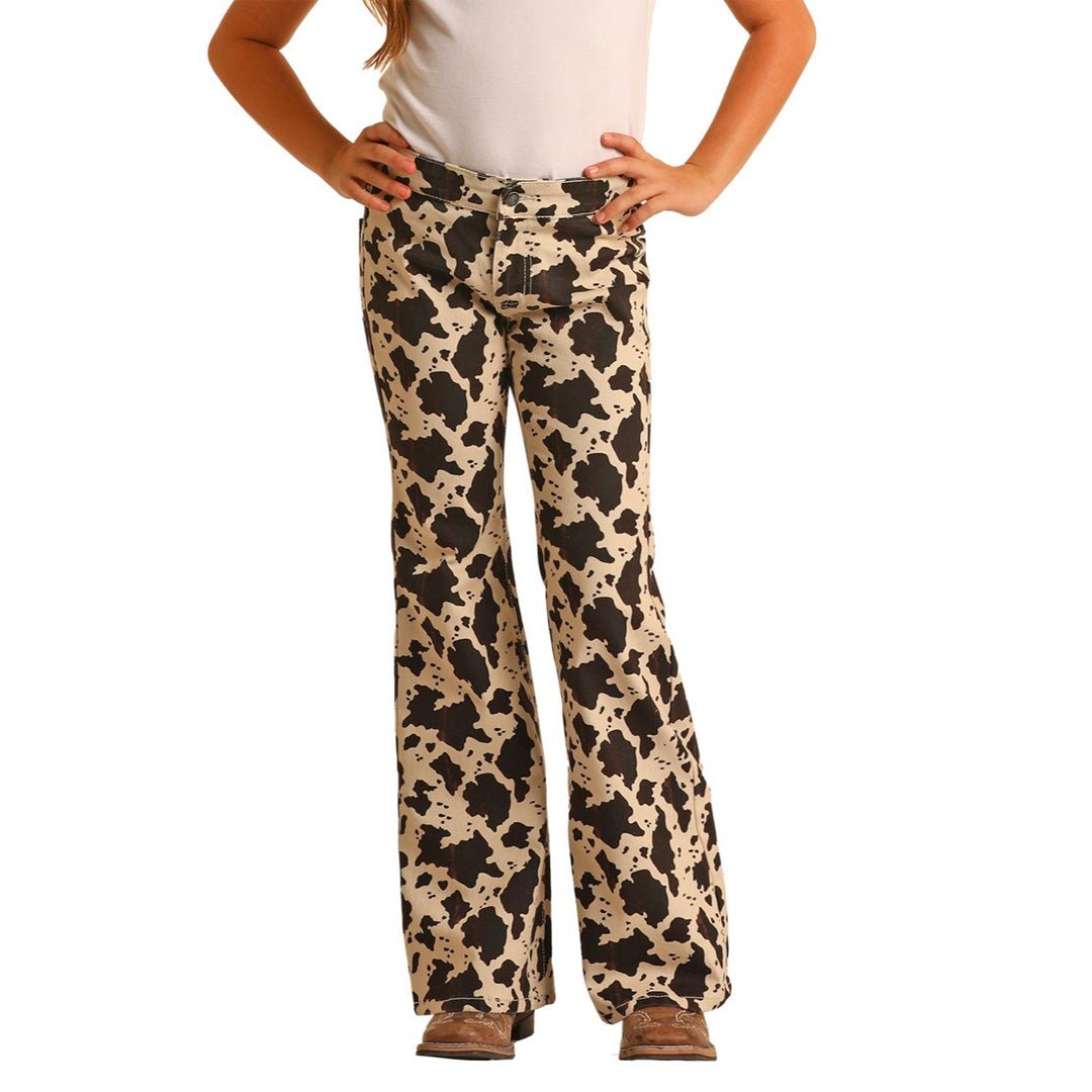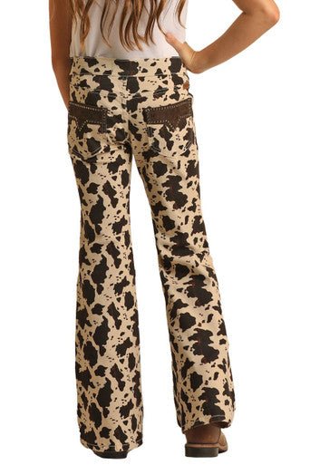 The Rock and Roll Girl's Mid Rise Stretch Flare Jeans are a fun and fashionable choice for young girls. These mid-rise jeans feature a trendy flare style and come in a versatile natural color. The standout details include a playful cow print and stylish studded pockets, adding a touch of flair. Made from a comfortable blend of 97% cotton and 3% spandex, the stretch fabric allows for easy movement. These jeans are currently on clearance.