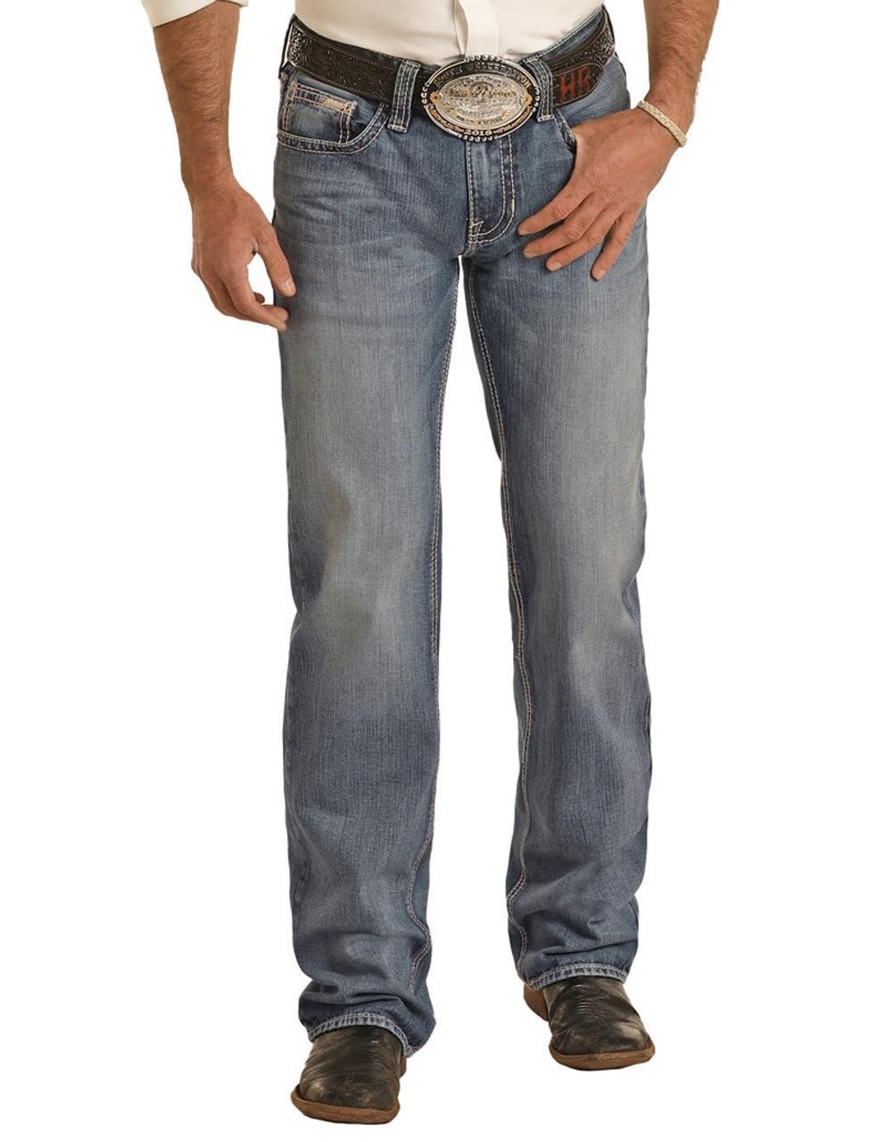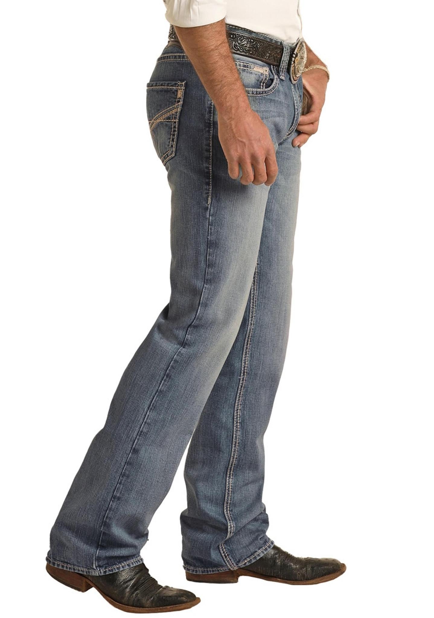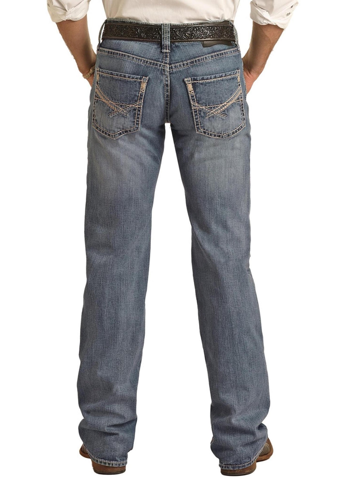 The Rock & Roll Men's Pistol Regular Fit Straight Bootcut Jean in a medium wash offers a classic and comfortable style for everyday wear. These jeans feature a regular fit through the seat and thigh and a mid-rise, providing a traditional silhouette. The straight bootcut leg opens to 18.5", designed to fit comfortably over cowboy boots.